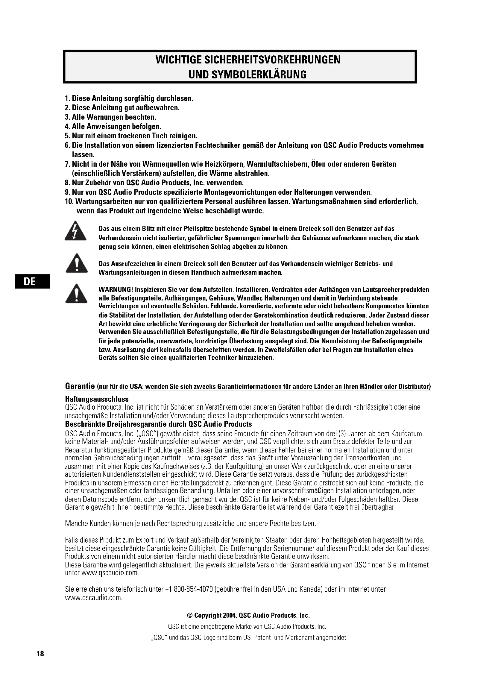 wenn das Produkt auf irgendeine Weise beschädigt wurde. Das aus einem Blitz mit einer Pfeilspitze bestehende Symbol in einem Dreieck soll den Benutzer auf das Vorhandensein nicht isolierter, gefährlicher Spannungen innerhalb des Gehäuses aufmerksam machen, die stark genug sein können, einen elektrischen Schlag abgeben zu können. Das Ausrufezeichen in einem Dreieck soll den Benutzer auf das Vorhandensein wichtiger Betriebs- und Wartungsanleitungen in diesem Handbuch aufmerksam machen. WARNUNG! Inspizieren Sie vor dem Aufstellen, Installieren, Verdrahten oder Aufhängen von Lautsprecherprodukten alle Befestigungsteile, Aufhängungen, Gehäuse, Wandler, Halterungen und damit in Verbindung stehende Vorrichtungen auf eventuelle Schäden. Fehlende, korrodierte, verformte oder nicht belastbare Komponenten könnten die Stabilität der Installation, der Aufstellung oder der Gerätekombination deutlich reduzieren. Jeder Zustand dieser Art bewirkt eine erhebliche Verringerung der Sicherheit der Installation und sollte umgehend behoben werden. Verwenden Sie ausschließlich Befestigungsteile, die für die Belastungsbedingungen der Installation zugelassen und für jede potenzielle, unerwartete, kurzfristige Überlastung ausgelegt sind. Die Nennleistung der Befestigungsteile bzw. Ausrüstung darf keinesfalls überschritten werden. In Zweifelsfällen oder bei Fragen zur Installation eines Geräts sollten Sie einen qualifizierten Techniker hinzuziehen. Garantie (nur für die USA; wenden Sie sich zwecks Garantieinformationen für andere Länder an Ihren Händler oder Distributor) Haftungsausschluss QSC Audio Products, Inc. ist nicht für Schäden an Verstärkern oder anderen Geräten haftbar, die durch Fahrlässigkeit oder eine unsachgemäße Installation und/oder Verwendung dieses Lautsprecherprodukts verursacht werden. Beschränkte Dreijahresgarantie durch QSC Audio Products QSC Audio Products, Inc. („QSC“) gewährleistet, dass seine Produkte für einen Zeitraum von drei (3) Jahren ab dem Kaufdatum keine Material- und/oder Ausführungsfehler aufweisen werden, und QSC verpflichtet sich zum Ersatz defekter Teile und zur Reparatur funktionsgestörter Produkte gemäß dieser Garantie, wenn dieser Fehler bei einer normalen Installation und unter normalen Gebrauchsbedingungen auftritt – vorausgesetzt, dass das Gerät unter Vorauszahlung der Transportkosten und zusammen mit einer Kopie des Kaufnachweises (z.B. der Kaufquittung) an unser Werk zurückgeschickt oder an eine unserer autorisierten Kundendienststellen eingeschickt wird. Diese Garantie setzt voraus, dass die Prüfung des zurückgeschickten Produkts in unserem Ermessen einen Herstellungsdefekt zu erkennen gibt. Diese Garantie erstreckt sich auf keine Produkte, die einer unsachgemäßen oder fahrlässigen Behandlung, Unfällen oder einer unvorschriftsmäßigen Installation unterlagen, oder deren Datumscode entfernt oder unkenntlich gemacht wurde. QSC ist für keine Neben- und/oder Folgeschäden haftbar. Diese Garantie gewährt Ihnen bestimmte Rechte. Diese beschränkte Garantie ist während der Garantiezeit frei übertragbar. Manche Kunden können je nach Rechtsprechung zusätzliche und andere Rechte besitzen. Falls dieses Produkt zum Export und Verkauf außerhalb der Vereinigten Staaten oder deren Hohheitsgebieten hergestellt wurde, besitzt diese eingeschränkte Garantie keine Gültigkeit. Die Entfernung der Seriennummer auf diesem Produkt oder der Kauf dieses Produkts von einem nicht autorisierten Händler macht diese beschränkte Garantie unwirksam. Diese Garantie wird gelegentlich aktualisiert. Die jeweils aktuellste Version der Garantieerklärung von QSC finden Sie im Internet unter www.qscaudio.com. Sie erreichen uns telefonisch unter +1 800-854-4079 (gebührenfrei in den USA und Kanada) oder im Internet unter www.qscaudio.com. © Copyright 2004, QSC Audio Products, Inc. QSC ist eine eingetragene Marke von QSC Audio Products, Inc. „QSC“ und das QSC-Logo sind beim US- Patent- und Markenamt angemeldetDE