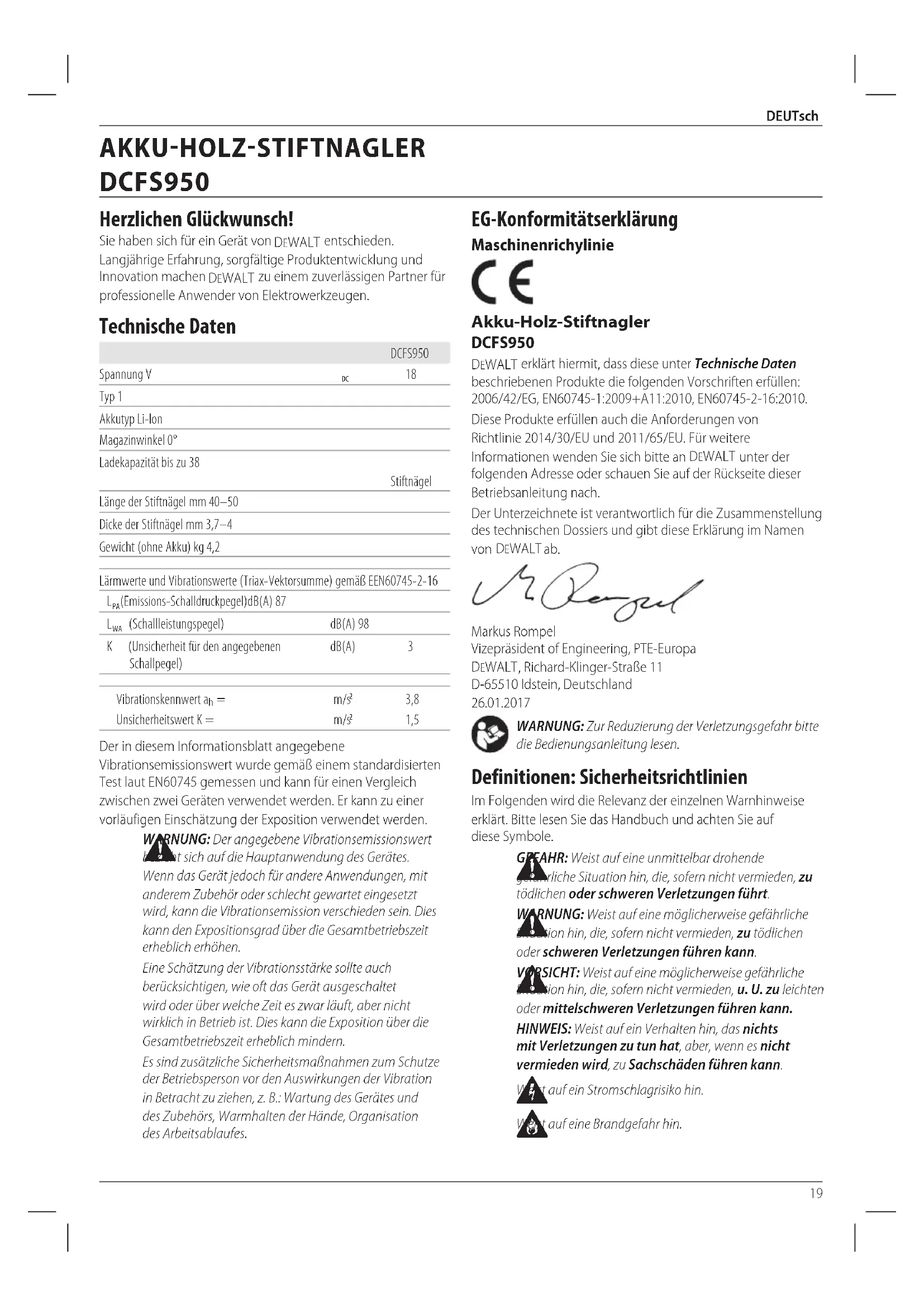 Klemmender Stiftnagel. Stiftnagelgröße oder -typ falsch. Verwenden Sie nur die empfohlenen Stiftnägel. Siehe Technische Daten. Das Magazin wurde nach der vorangegangenen Staubeseitigung/Inspektion nicht gesichert. Stellen Sie sicher, dass das Magazin richtig eingerastet ist. Beschädigter oder verschlissener Eintreiber. Eintreiber mit Hilfe des Kits austauschen oder eine autorisierte Kundendienststelle aufsuchen. Material und Nagellänge. Wenn das Werkzeug weiter blockiert wird (der Blockierungslösehebel gedreht werden muss), wählen Sie das geeignete Material und Befestigungsmittel in geeigneter Länge, die für eine Anwendung nicht zu schwer sind. Verschmutzungen im Mundstück. Reinigen Sie den Mundbereich, und suchen Sie genau nach kleinen Teilen zerbrochener Stiftnägel, die in der Führung stecken geblieben sind. Beschädigte Drückerfeder. Wechseln Sie die Federn. Autorisierte Vertragswerkstatt aufsuchen. Werkzeug ist noch nicht eingelaufen. Neue Werkzeuge brauchen 100-500 Stiftnägel, damit sich die Teile verzahnen oder ineinandergreifen. Treiben Sie während dieser Zeit kürzere Stiftnägel ein, wenn es schwierig ist, sie vollständig einzutreiben. Verschlissenes Magazin. Wechseln Sie das Magazin. Autorisierte Vertragswerkstatt aufsuchen. Stiftnagel wird zu tief eingetrieben. Leistungseinstellung zu hoch. Wählen Sie eine niedrigere Leistungseinstellung. Tiefeneinstellung falsch. Regler für werkzeugfreie Tiefeneinstellung anpassen. Stiftnagel verbiegt sich. Stiftnagel ist auf Astknoten getroffen. Gerät ca. 8 cm weiter bewegen und erneut versuchen.36 EnGLIsh EC-Declaration of Conformity Machinery Directive Cordless Fencing Stapler DCFS950 DeWALT declares that these products described under Technical Data are in compliance with: 2006/42/EC, EN60745-1:2009+A11:2010, EN60745-2-16:2010. These products also comply with Directive 2014/30/EU and 2011/65/EU. For more information, please contact DeWALT