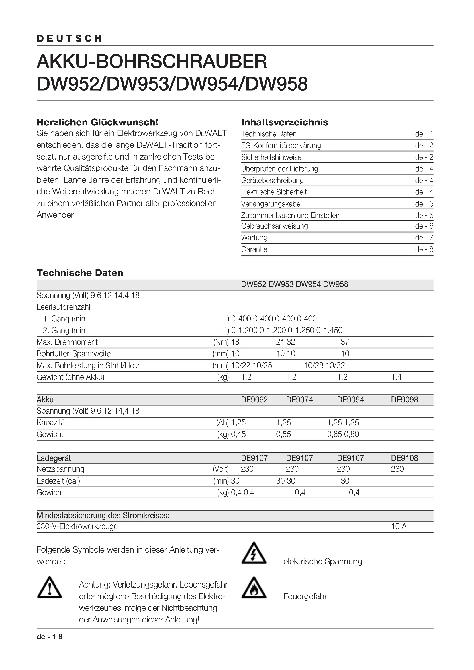 ) 0-1.200 0-1.200 0-1.250 0-1.450 Max. Drehmoment (Nm) 18 21 32 37 Bohrfutter-Spannweite (mm) 10 10 10 10 Max. Bohrleistung in Stahl/Holz (mm) 10/22 10/25 10/28 10/32 Gewicht (ohne Akku) (kg) 1,2 1,2 1,2 1,4 Akku DE9062 DE9074 DE9094 DE9098 Spannung (Volt) 9,6 12 14,4 18 Kapazität (Ah) 1,25 1,25 1,25 1,25 Gewicht (kg) 0,45 0,55 0,65 0,80 Ladegerät DE9107 DE9107 DE9107 DE9108 Netzspannung (Volt) 230 230 230 230 Ladezeit (ca.) (min) 30 30 30 30 Gewicht (kg) 0,4 0,4 0,4 0,4 Mindestabsicherung des Stromkreises: 230-V-Elektrowerkzeuge 10 A Folgende Symbole werden in dieser Anleitung ver- wendet: Achtung: Verletzungsgefahr, Lebensgefahr oder mögliche Beschädigung des Elektro- werkzeuges infolge der Nichtbeachtung der Anweisungen dieser Anleitung! elektrische Spannung Feuergefahr Inhaltsverzeichnis Technische Daten de - 1 EG-Konformitätserklärung de - 2 Sicherheitshinweise de - 2 Überprüfen der Lieferung de - 4 Gerätebeschreibung de - 4 Elektrische Sicherheit de - 4 Verlängerungskabel de - 5 Zusammenbauen und Einstellen de - 5 Gebrauchsanweisung de - 6 Wartung de - 7 Garantie de - 8DEUTSCH 9 de - 2 EG-Konformitätserklärung DW952/DW953/DW954/DW958 DEWALT erklärt hiermit, daß diese Elektrowerkzeuge entsprechend den Richtlinien und Normen 89/392/EWG, 89/336/EWG, 73/23/EWG, EN 50144, EN 55104 / EN 55014-2, EN 55014, EN 61000-3-2 und EN 61000-3-3 konzipiert wurden. Für weitere Informationen wenden Sie sich bitte an die Adresse weiter unten oder an eine der auf der Rückseite dieser Anleitung genannten Niederlassun- gen. Die Höhe des Schalldrucks entspricht den Richtlini- en der Europäischen Gemeinschaft 86/188/EWG und 89/392/EWG gemessen nach EN 50144: DW952 DW953 DW954 DW958