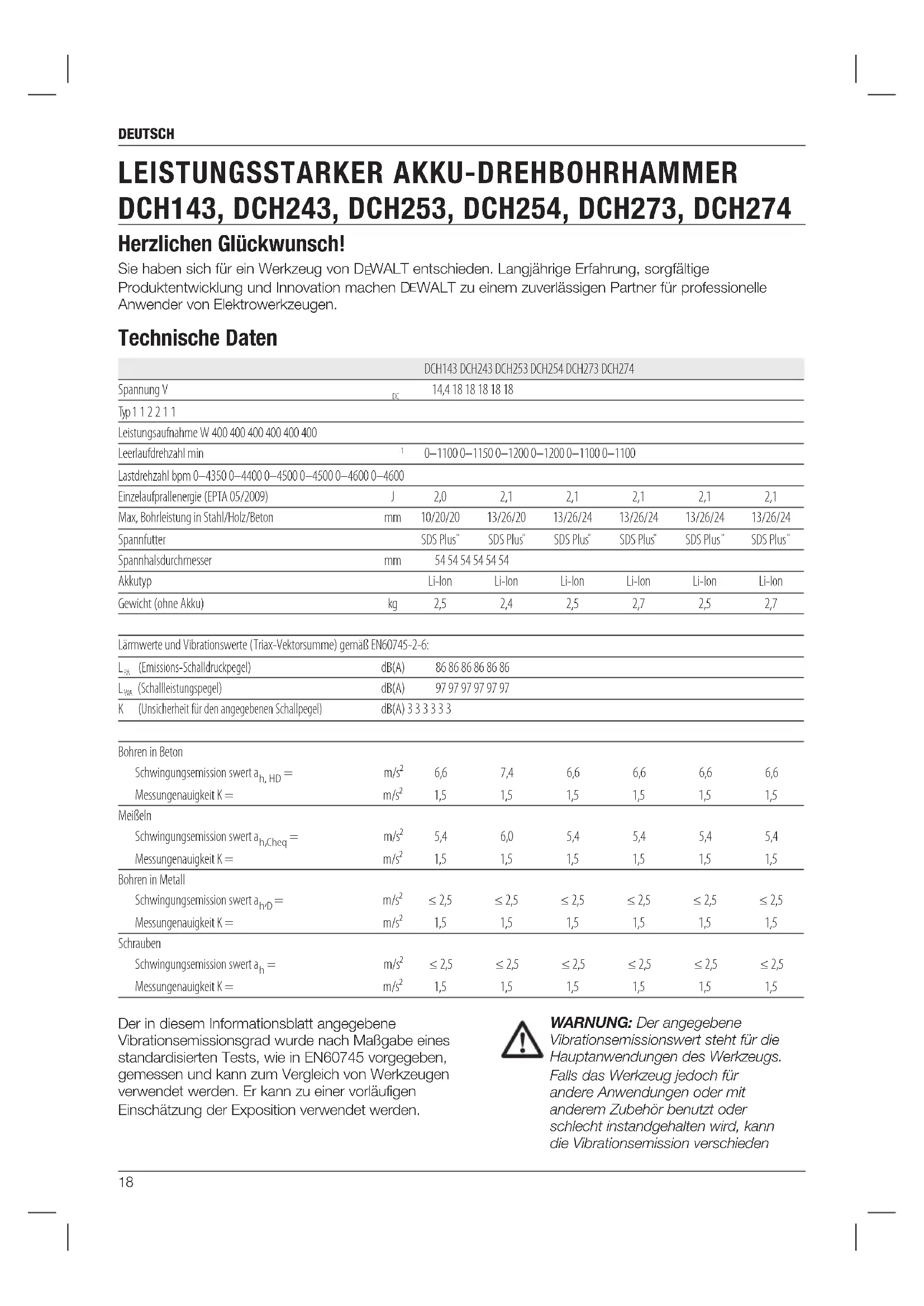 Ihr DCH143, DCH243, DCH253, DCH254, DCH273 und DCH274 Akku-Drehbohrhammer wurden für professionelle Bohr- und Hammerbohranwendungen Vor der Verwendung die Betriebsanleitung lesen. Die Ladezeit ist den Technischen Daten zu entnehmen. Akku wird geladen. Akku ist geladen. Akku ist defekt. Temperaturverzögerung. Nicht mit elektrisch leitenden Gegenständen berühren. Beschädigte Akkus nicht aufladen. Das Gerät keiner Nässe aussetzen. Beschädigte Kabel sofort austauschen. Nur zwischen 4˚C und 40˚C aufladen. Nur in Innenräumen verwenden. Akku umweltgerecht entsorgen. Laden Sie DeWALT -Akkus nur mit den dazu bestimmten DeWALT -Ladegeräten auf. Werden andere Akkus als die dazu bestimmten DeWALT -Akkus mit einem DeWALT -Ladegerät aufgeladen, können diese platzen oder andere gefährliche Situationen verursachen. Den Akku nicht verbrennen. Packungsinhalt Die Packung enthält: 1 Akku-Bohrhammer 1 Seitlicher Handgriff und Tiefenbohrstange 1 Ladegerät 1 Akku (D1, L1, M1, P1)28 Deutsch Mindestquerschnitt beträgt 1mm