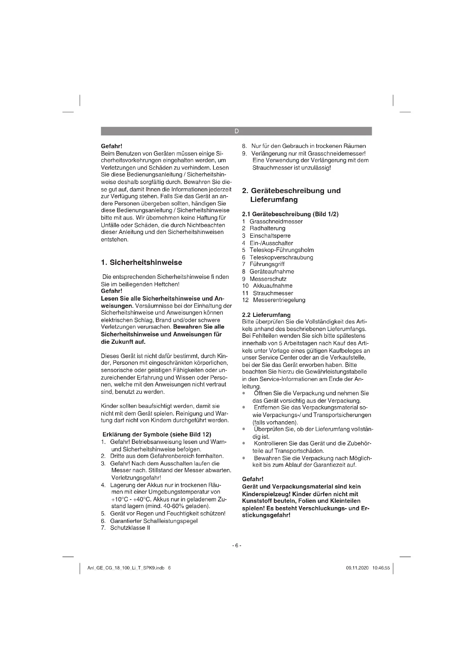 Bewahren Sie die Verpackung nach Möglich- keit bis zum Ablauf der Garantiezeit auf. Gefahr! Gerät und Verpackungsmaterial sind kein Kinderspielzeug! Kinder dürfen nicht mit Kunststoff beuteln, Folien und Kleinteilen spielen! Es besteht Verschluckungs- und Er- stickungsgefahr! Anl_GE_CG_18_100_Li_T_SPK9.indb 6Anl_GE_CG_18_100_Li_T_SPK9.indb 6 09.11.2020 10:46:5509.11.2020 10:46:55D