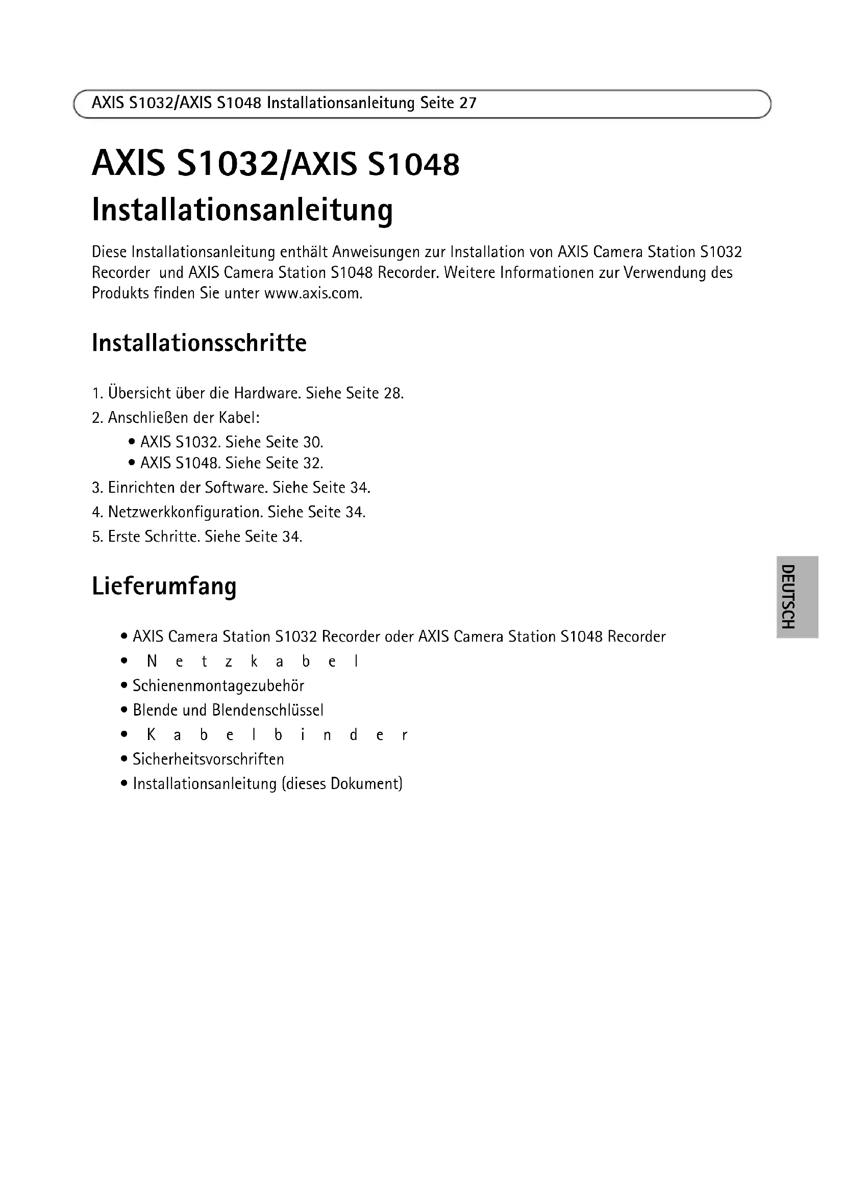 Installationsanleitung Diese Installationsanleitung enthält Anweisungen zur Installation von AXIS Camera Station S1032 Recorder und AXIS Camera Station S1048 Recorder. Weitere Informationen zur Verwendung des Produkts finden Sie unter www.axis.com. Installationsschritte
