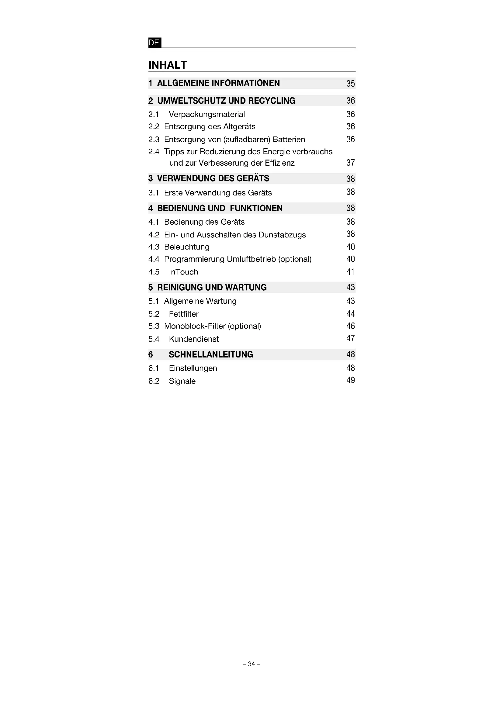 Der Motor gehtsofort aus.Motordrehzahl erhöhen Motordrehzahl verringern Beleuchtung eingeschaltet Dimmen der Beleuchtung Drücken Sie weiterhin.Umluftmodus aktivieren für 3 SekundenRote LED blinkt 5x! Der Motor mussausgeschaltet sein!Umluftmodus deaktivieren für 3 SekundenDritte grüne LEDblinkt 5x !! Der Motor musseingeschaltet sein!ReinigungsanzeigeFettfilter zurücksetzen für 5 SekundenAustauschanzeige Monoblock zurücksetzen für 3 SekundenRote LED blinkt 3x! Der Motor musseingeschaltet sein!Einschalten InTouch für 3 Sekundenzweite und dritte LED blinken ! Der Motor mussausgeschaltet sein!Ausschalten InTouch➊ + ➋für 3 Sekundenzweite und dritte LED blinken! Der Motor mussausgeschaltet sein!– 48 – – 49 –