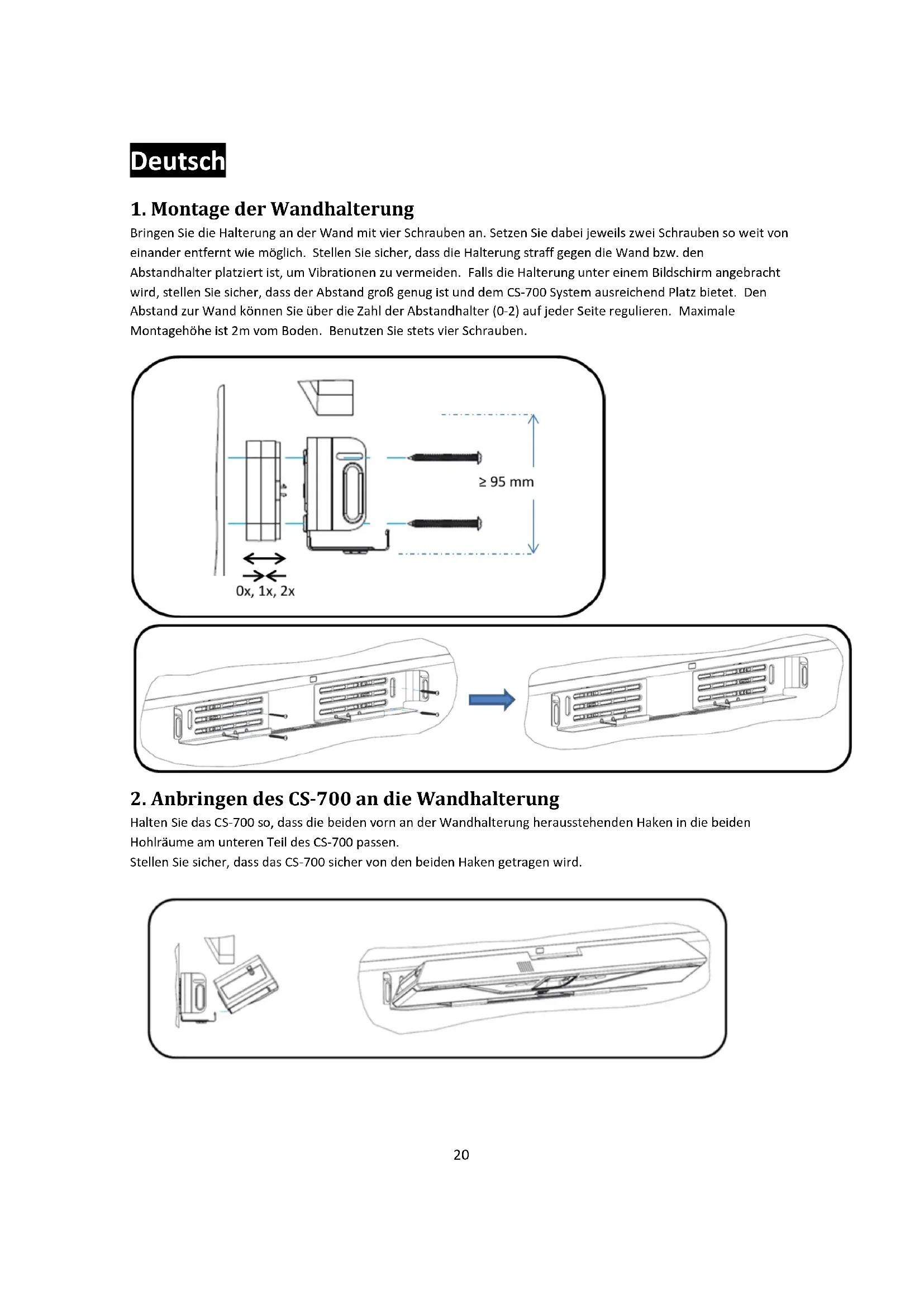 Bringen Sie die Halterung an der Wand mit vier Schrauben an. Setzen Sie dabei jeweils zwei Schrauben so weit von einander entfernt wie möglich. Stellen Sie sicher, dass die Halterung straff gegen die Wand bzw. den Abstandhalter platziert ist, um Vibrationen zu vermeiden. Falls die Halterung unter einem Bildschirm angebracht wird, stellen Sie sicher, dass der Abstand groß genug ist und dem CS-700 System ausreichend Platz bietet. Den Abstand zur Wand können Sie über die Zahl der Abstandhalter (0-2) auf jeder Seite regulieren. Maximale Montagehöhe ist 2m vom Boden. Benutzen Sie stets vier Schrauben.