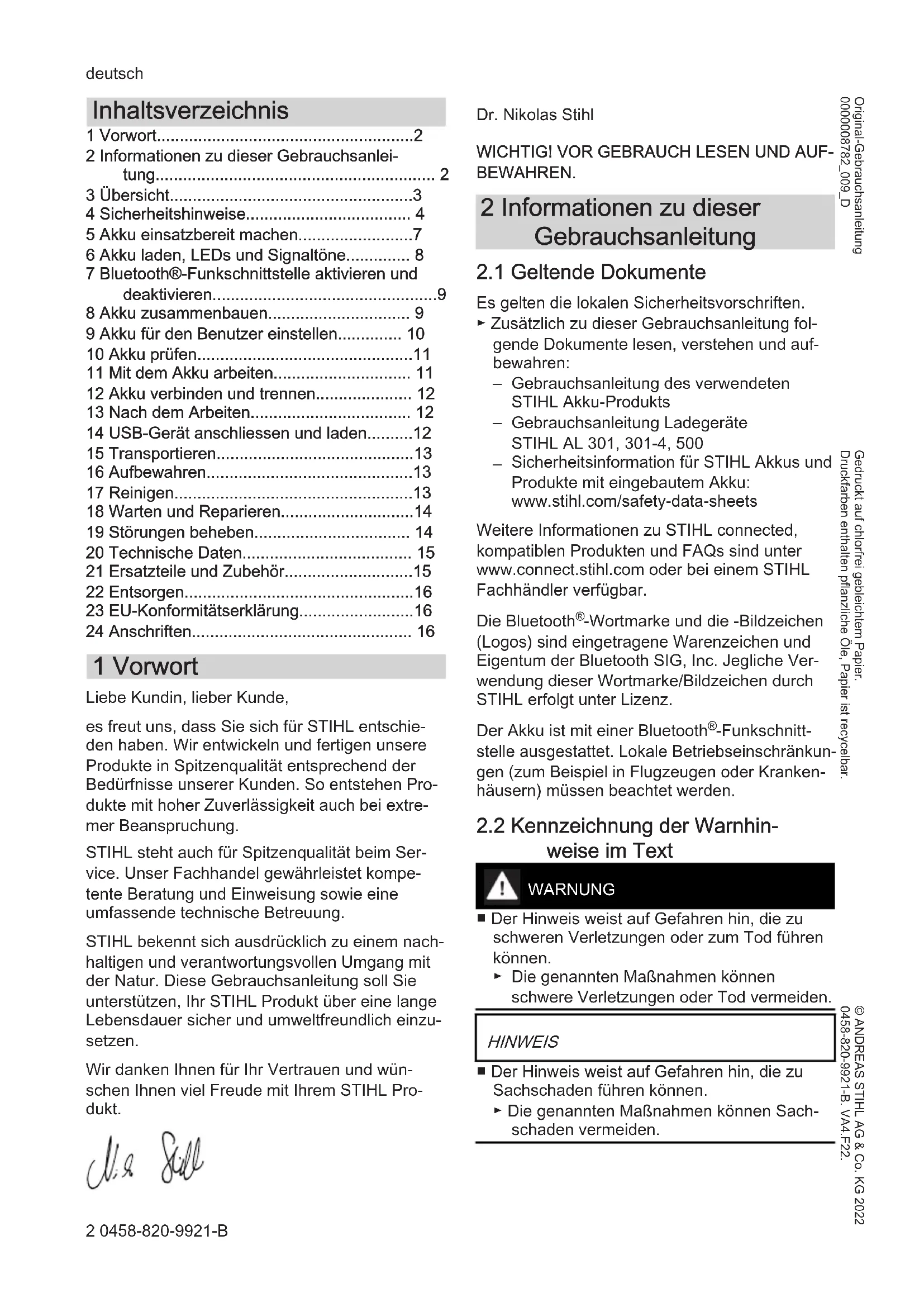 - 24 Anschriften 1 Vorwort Liebe Kundin, lieber Kunde, es freut uns, dass Sie sich für STIHL entschie‐ den haben. Wir entwickeln und fertigen unsere Produkte in Spitzenqualität entsprechend der Bedürfnisse unserer Kunden. So entstehen Pro‐ dukte mit hoher Zuverlässigkeit auch bei extre‐ mer Beanspruchung. STIHL steht auch für Spitzenqualität beim Ser‐ vice. Unser Fachhandel gewährleistet kompe‐ tente Beratung und Einweisung sowie eine umfassende technische Betreuung. STIHL bekennt sich ausdrücklich zu einem nach‐ haltigen und verantwortungsvollen Umgang mit der Natur. Diese Gebrauchsanleitung soll Sie unterstützen, Ihr STIHL Produkt über eine lange Lebensdauer sicher und umweltfreundlich einzu‐ setzen. Wir danken Ihnen für Ihr Vertrauen und wün‐ schen Ihnen viel Freude mit Ihrem STIHL Pro‐ dukt. Dr. Nikolas Stihl p. 16