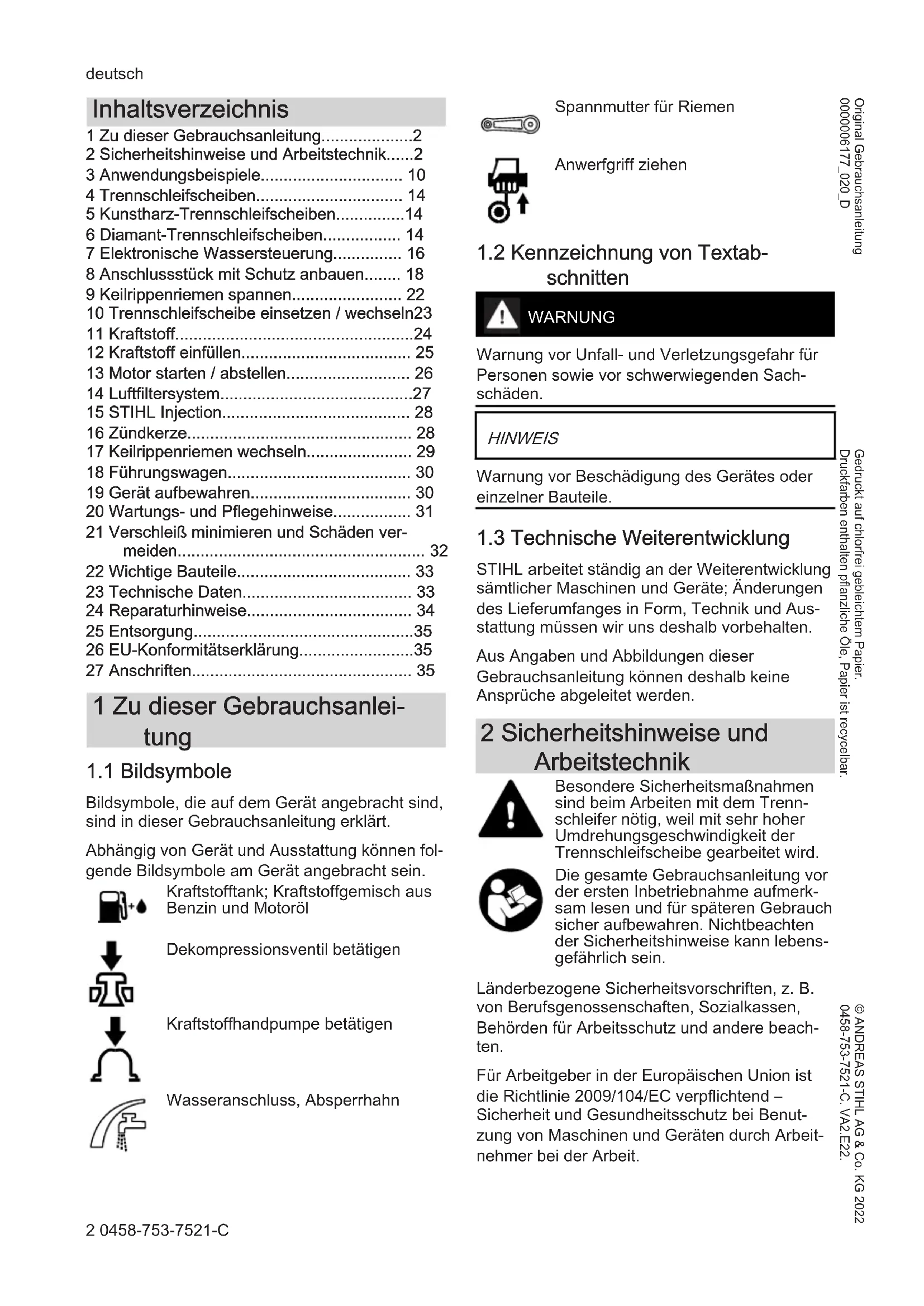 STIHL arbeitet ständig an der Weiterentwicklung sämtlicher Maschinen und Geräte; Änderungen des Lieferumfanges in Form, Technik und Aus‐ stattung müssen wir uns deshalb vorbehalten. Aus Angaben und Abbildungen dieser Gebrauchsanleitung können deshalb keine Ansprüche abgeleitet werden. 2 Sicherheitshinweise und Arbeitstechnik Besondere Sicherheitsmaßnahmen sind beim Arbeiten mit dem Trenn‐ schleifer nötig, weil mit sehr hoher Umdrehungsgeschwindigkeit der Trennschleifscheibe gearbeitet wird. Die gesamte Gebrauchsanleitung vor der ersten Inbetriebnahme aufmerk‐ sam lesen und für späteren Gebrauch sicher aufbewahren. Nichtbeachten der Sicherheitshinweise kann lebens‐ gefährlich sein. Länderbezogene Sicherheitsvorschriften, z. B. von Berufsgenossenschaften, Sozialkassen, Behörden für Arbeitsschutz und andere beach‐ ten. Für Arbeitgeber in der Europäischen Union ist die Richtlinie 2009/104/EC verpflichtend – Sicherheit und Gesundheitsschutz bei Benut‐ zung von Maschinen und Geräten durch Arbeit‐ nehmer bei der Arbeit. deutsch 2 0458-753-7521-C © ANDREAS STIHL AG & Co. KG 2022 0458-753-7521-C. VA2.E22. Gedruckt auf chlorfrei gebleichtem Papier. Druckfarben enthalten pflanzliche Öle, Papier ist recycelbar. Original Gebrauchsanleitung 0000006177_020_DWer zum ersten Mal mit dem Motorgerät arbeitet: Vom Verkäufer oder einem anderen Fachkundi‐ gen erklären lassen, wie man damit sicher umgeht – oder an einem Fachlehrgang teilneh‐ men. Minderjährige dürfen nicht mit dem Motorgerät arbeiten – ausgenommen Jugendliche über 16 Jahre, die unter Aufsicht ausgebildet werden. Kinder, Tiere und Zuschauer fern halten. Wird das Motorgerät nicht benutzt, ist es so abzustellen, dass niemand gefährdet wird. Motorgerät vor unbefugtem Zugriff sichern. Der Benutzer ist verantwortlich für Unfälle oder Gefahren, die gegenüber anderen Personen oder deren Eigentum auftreten. Motorgerät nur an Personen weitergeben oder ausleihen, die mit diesem Modell und seiner Handhabung vertraut sind – stets die Gebrauchs‐ anleitung mitgeben. Der Einsatz Schall emittierender Motorgeräte kann durch nationale wie auch örtliche, lokale Vorschriften zeitlich begrenzt sein. Wer mit dem Motorgerät arbeitet, muss ausge‐ ruht, gesund und in guter Verfassung sein. Wer sich aus gesundheitlichen Gründen nicht anstrengen darf, sollte seinen Arzt fragen, ob die Arbeit mit einem Motorgerät möglich ist. Nur Träger von Herzschrittmachern: Die Zündan‐ lage dieses Gerätes erzeugt ein sehr geringes elektromagnetisches Feld. Ein Einfluss auf ein‐ zelne Herzschrittmacher-Typen kann nicht völlig ausgeschlossen werden. Zur Vermeidung von gesundheitlichen Risiken empfiehlt STIHL den behandelnden Arzt und den Hersteller des Herz‐ schrittmachers zu befragen. Nach der Einnahme von Alkohol, Medikamenten, die das Reaktionsvermögen beeinträchtigen oder Drogen darf nicht mit dem Motorgerät gearbeitet werden. Bei ungünstigem Wetter (Schnee, Eis, Sturm) die Arbeit verschieben – erhöhte Unfallgefahr! Das Motorgerät ist nur zum Trennschleifen vor‐ gesehen. Es ist nicht geeignet zum Trennen von Holz oder hölzernen Gegenständen. Asbeststaub ist äußerst gesundheitsschädlich – niemals Asbest trennen! Der Einsatz des Motorgeräts für andere Zwecke ist nicht zulässig und kann zu Unfällen oder Schäden am Motorgerät führen. Keine Änderungen am Gerät vornehmen – die Sicherheit kann dadurch gefährdet werden. Für Personen- und Sachschäden, die bei der Ver‐ wendung nicht zugelassener Anbaugeräte auf‐ treten, schließt STIHL jede Haftung aus. Nur solche Trennschleifscheiben oder Zubehöre anbauen, die von STIHL für dieses Motorgerät zugelassen sind oder technisch gleichartige Teile. Bei Fragen dazu an einen Fachhändler wenden. Nur hochwertige Trennschleifscheiben oder Zubehöre verwenden. Ansonsten kann die Gefahr von Unfällen oder Schäden am Motorge‐ rät bestehen. STIHL empfiehlt STIHL Original Trennschleif‐ scheiben und Zubehör zu verwenden. Diese sind in ihren Eigenschaften optimal auf das Produkt und die Anforderungen des Benutzers abge‐ stimmt. Zur Reinigung des Gerätes keine Hochdruckrei‐ niger verwenden. Der harte Wasserstrahl kann Teile des Gerätes beschädigen. Gerät nicht mit Wasser abspritzen. Niemals Kreissägeblätter, Hartme‐ tall-, Bergungs-, Holzschneide- oder andere verzahnte Werkzeuge ver‐ wenden – Gefahr tödlicher Verletzun‐ gen! Im Gegensatz zum gleichmäßi‐ gen Abtragen von Partikeln bei Benutzung von Trennschleifscheiben, können die Zähne eines Kreissäge‐ blattes beim Schneiden in den Werk‐ stoff einhaken. Dies bewirkt ein aggressives Schneidverhalten und kann zu unkontrollierten, äußerst gefährlichen Reaktionskräften (Hoch‐ schlagen) des Gerätes führen.
