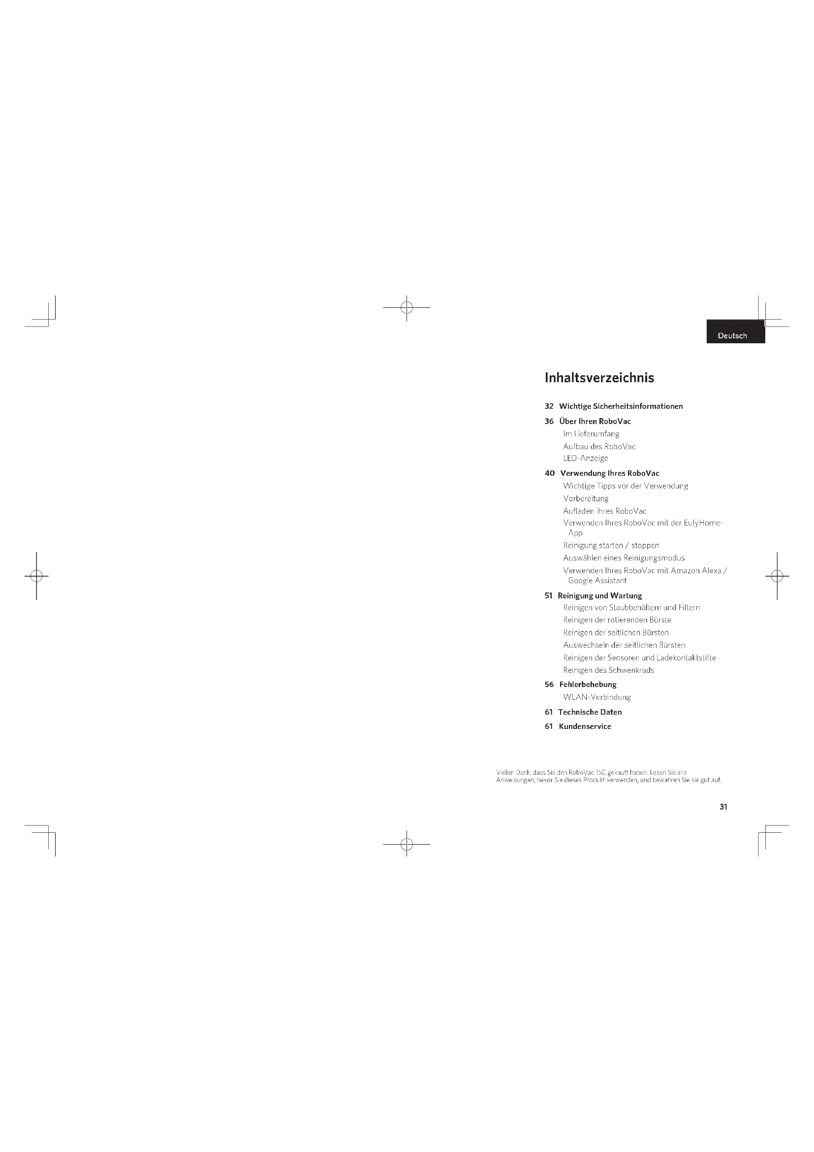 - Beachten Sie, dass dieses Gerät sich eigenständig bewegt. Gehen Sie beim Betreten des Bereichs, in dem das Gerät34 35 Deutsch Deutsch betrieben wird, vorsichtig vor, damit Sie nicht versehentlich auf das Gerät treten.