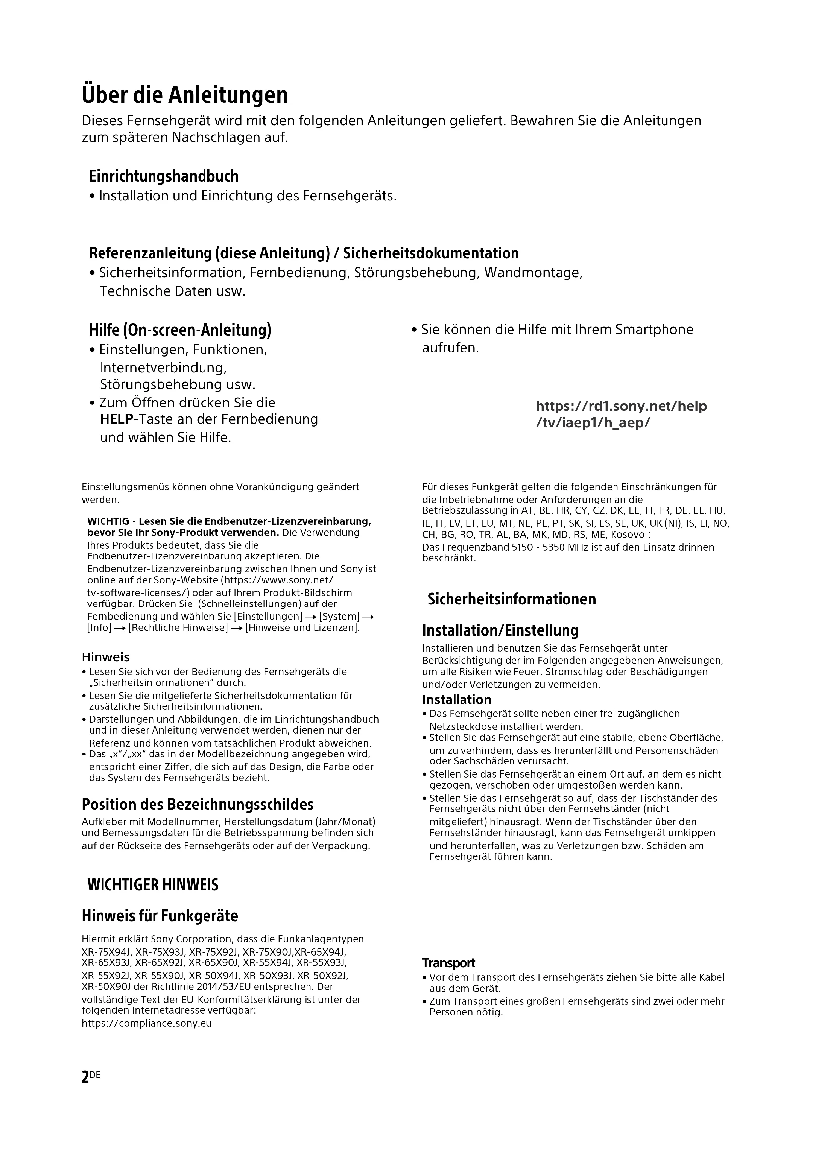 - Lesen Sie sich vor der Bedienung des Fernsehgeräts die „Sicherheitsinformationen“ durch.• Lesen Sie die mitgelieferte Sicherheitsdokumentation für zusätzliche Sicherheitsinformationen.• Darstellungen und Abbildungen, die im Einrichtungshandbuch und in dieser Anleitung verwendet werden, dienen nur der Referenz und können vom tatsächlichen Produkt abweichen.• Das „x“/„xx“ das in der Modellbezeichnung angegeben wird, entspricht einer Ziffer, die sich auf das Design, die Farbe oder das System des Fernsehgeräts bezieht. Position des Bezeichnungsschildes Aufkleber mit Modellnummer, Herstellungsdatum (Jahr/Monat) und Bemessungsdaten für die Betriebsspannung befinden sich auf der Rückseite des Fernsehgeräts oder auf der Verpackung. WICHTIGER HINWEIS Hinweis für Funkgeräte Hiermit erklärt Sony Corporation, dass die Funkanlagentypen XR-75X94J, XR-75X93J, XR-75X92J, XR-75X90J,XR-65X94J, XR-65X93J, XR-65X92J, XR-65X90J, XR-55X94J, XR-55X93J, XR-55X92J, XR-55X90J, XR-50X94J, XR-50X93J, XR-50X92J, XR-50X90J der Richtlinie 2014/53/EU entsprechen. Der vollständige Text der EU-Konformitätserklärung ist unter der folgenden Internetadresse verfügbar: https://compliance.sony.euFür dieses Funkgerät gelten die folgenden Einschränkungen für die Inbetriebnahme oder Anforderungen an die Betriebszulassung in AT, BE, HR, CY, CZ, DK, EE, FI, FR, DE, EL, HU, IE, IT, LV, LT, LU, MT, NL, PL, PT, SK, SI, ES, SE, UK, UK (NI), IS, LI, NO, CH, BG, RO, TR, AL, BA, MK, MD, RS, ME, Kosovo :Das Frequenzband 5150 - 5350 MHz ist auf den Einsatz drinnen beschränkt. Sicherheitsinformationen Installation/Einstellung Installieren und benutzen Sie das Fernsehgerät unter Berücksichtigung der im Folgenden angegebenen Anweisungen, um alle Risiken wie Feuer, Stromschlag oder Beschädigungen und/oder Verletzungen zu vermeiden. Installation