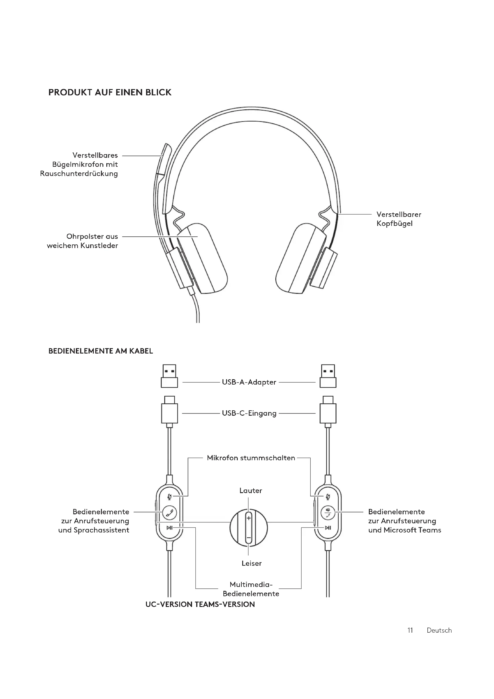 Verstellbarer Kopfbügel Multimedia- Bedienelemente UC-VERSION TEAMS-VERSION Bedienelemente zurAnrufsteuerung undSprachassistent Ohrpolster aus weichemKunstleder Mikrofon stummschalten Verstellbares Bügelmikrofon mit Rauschunterdrückung Lauter Leiser Bedienelemente zurAnrufsteuerung und Microsoft Teams