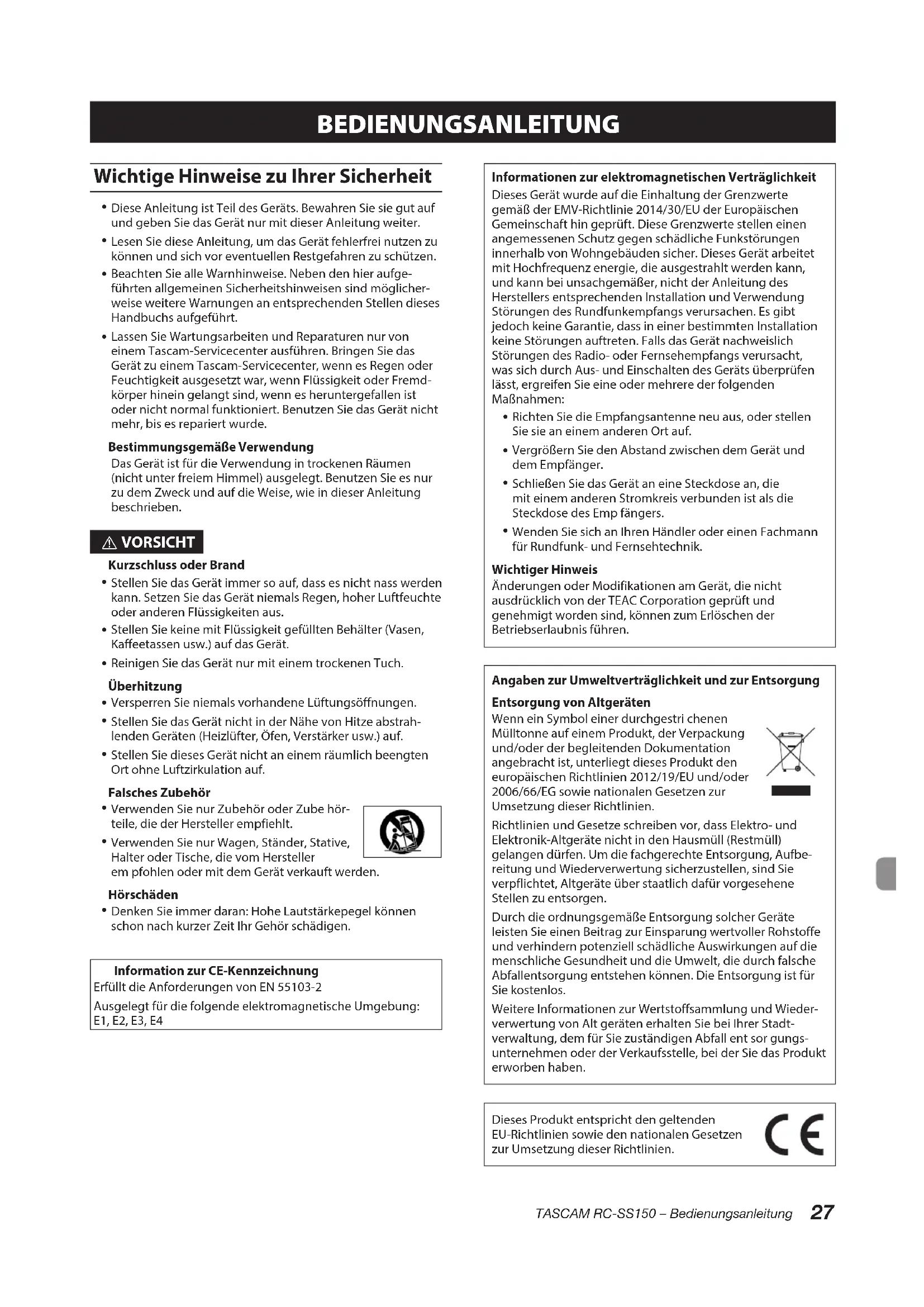 Wenden Sie sich an Ihren Händler oder einen Fachmann für Rundfunk- und Fernsehtechnik. Wichtiger Hinweis Änderungen oder Modifikationen am Gerät, die nicht ausdrücklich von der TEAC Corporation geprüft und genehmigt worden sind, können zum Erlöschen der Betriebserlaubnis führen. Angaben zur Umweltverträglichkeit und zur Entsorgung Entsorgung von Altgeräten Wenn ein Symbol einer durchgestri chenen Mülltonne auf einem Produkt, der Verpackung und/oder der begleitenden Dokumentation angebracht ist, unterliegt dieses Produkt den europäischen Richtlinien 2012/19/EU und/oder 2006/66/EG sowie nationalen Gesetzen zur Umsetzung dieser Richtlinien. Richtlinien und Gesetze schreiben vor, dass Elektro- und Elektronik-Altgeräte nicht in den Hausmüll (Restmüll) gelangen dürfen. Um die fachgerechte Entsorgung, Aufbe- reitung und Wiederverwertung sicherzustellen, sind Sie verpflichtet, Altgeräte über staatlich dafür vorgesehene Stellen zu entsorgen. Durch die ordnungsgemäße Entsorgung solcher Geräte leisten Sie einen Beitrag zur Einsparung wertvoller Rohstoffe und verhindern potenziell schädliche Auswirkungen auf die menschliche Gesundheit und die Umwelt, die durch falsche Abfallentsorgung entstehen können. Die Entsorgung ist für Sie kostenlos. Weitere Informationen zur Wertstoffsammlung und Wieder- verwertung von Alt geräten erhalten Sie bei Ihrer Stadt- verwaltung, dem für Sie zuständigen Abfall ent sor gungs- unternehmen oder der Verkaufsstelle, bei der Sie das Produkt erworben haben. Dieses Produkt entspricht den geltenden EU-Richtlinien sowie den nationalen Gesetzen zur Umsetzung dieser Richtlinien.28 TASCAM RC-SS150 – Bedienungsanleitung Bevor Sie beginnen Vielen Dank, dass Sie sich für die Direktwiedergabe- Fernbedienung RC-SS150 von Tascam entschieden haben. Durch ihr LC-Farbdisplay erlaubt diese Fernbedienung die intuitive Bedienung der Recorder-Modelle SS-R250N und SS-CDR250N. Bevor Sie die Fernbedienung benutzen, lesen Sie sich diese Anleitung bitte aufmerksam durch. Nur so ist sichergestellt, dass Sie die Fernbedienung richtig bedienen und Ihnen keine der eingebauten Funktionen entgeht. Wir hoffen, dass Ihnen das Gerät viele Jahre lang zuverlässige Dienste leisten wird. Bitte bewahren Sie diese Anleitung gut auf, damit Sie bei Bedarf jederzeit darauf zurückgreifen können. Eine digitale Version des Handbuchs steht auf unserer Website (http://tascam.eu/de) zum Download bereit. Hauptmerkmale