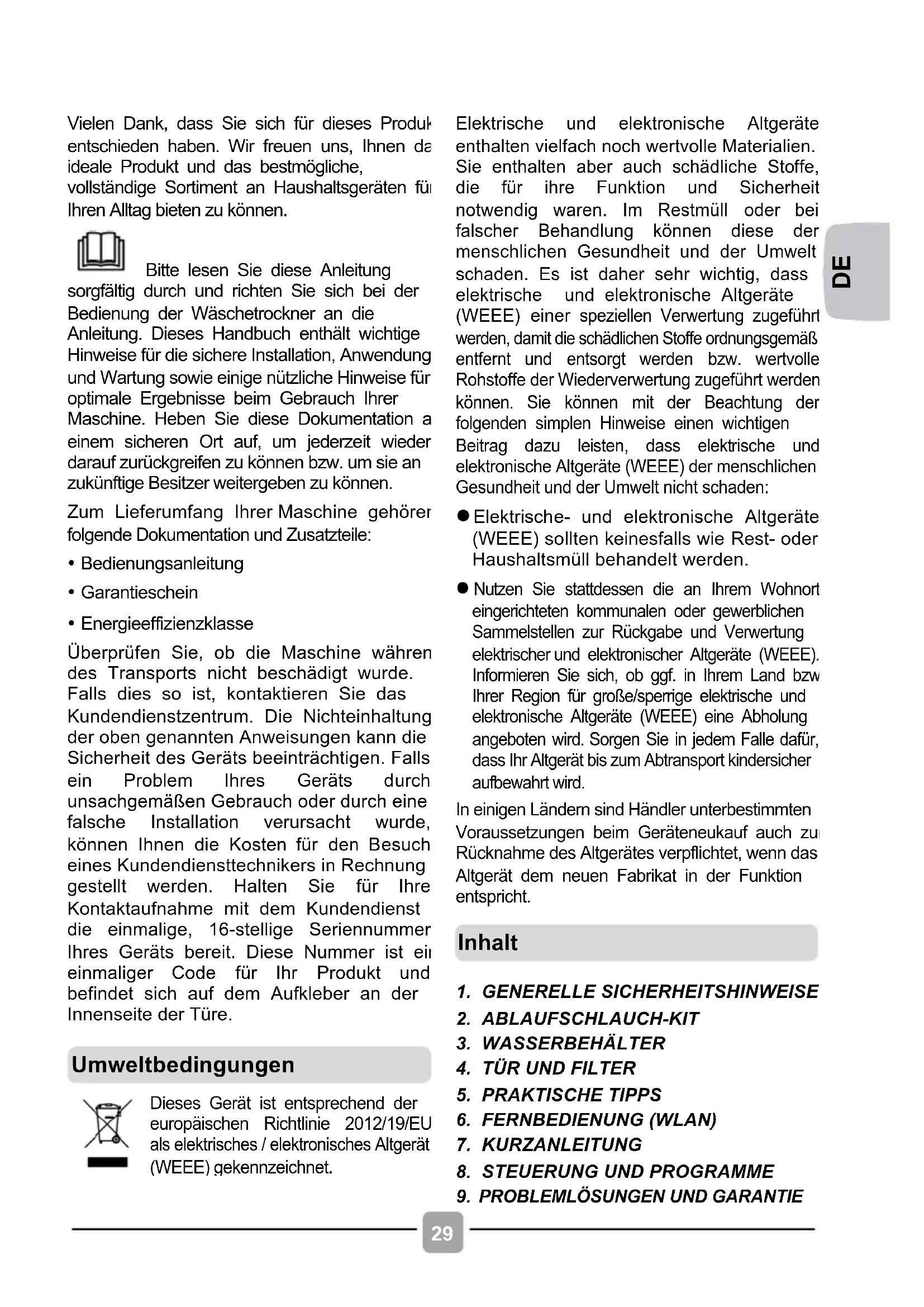 Vielen Dank, dass Sie sich für dieses Produkt entschieden haben. Wir freuen uns, Ihnen das ideale Produkt und das bestmögliche, vollständige Sortiment an Haushaltsgeräten für Ihren Alltag bieten zu können. Bitte lesen Sie diese Anleitung sorgfältig durch und richten Sie sich bei der Bedienung der Wäschetrockner an die Anleitung. Dieses Handbuch enthält wichtige Hinweise für die sichere Installation, Anwendung und Wartung sowie einige nützliche Hinweise für optimale Ergebnisse beim Gebrauch Ihrer Maschine. Heben Sie diese Dokumentation an einem sicheren Ort auf, um jederzeit wieder darauf zurückgreifen zu können bzw. um sie an zukünftige Besitzer weitergeben zu können. Zum Lieferumfang Ihrer Maschine gehören folgende Dokumentation und Zusatzteile: