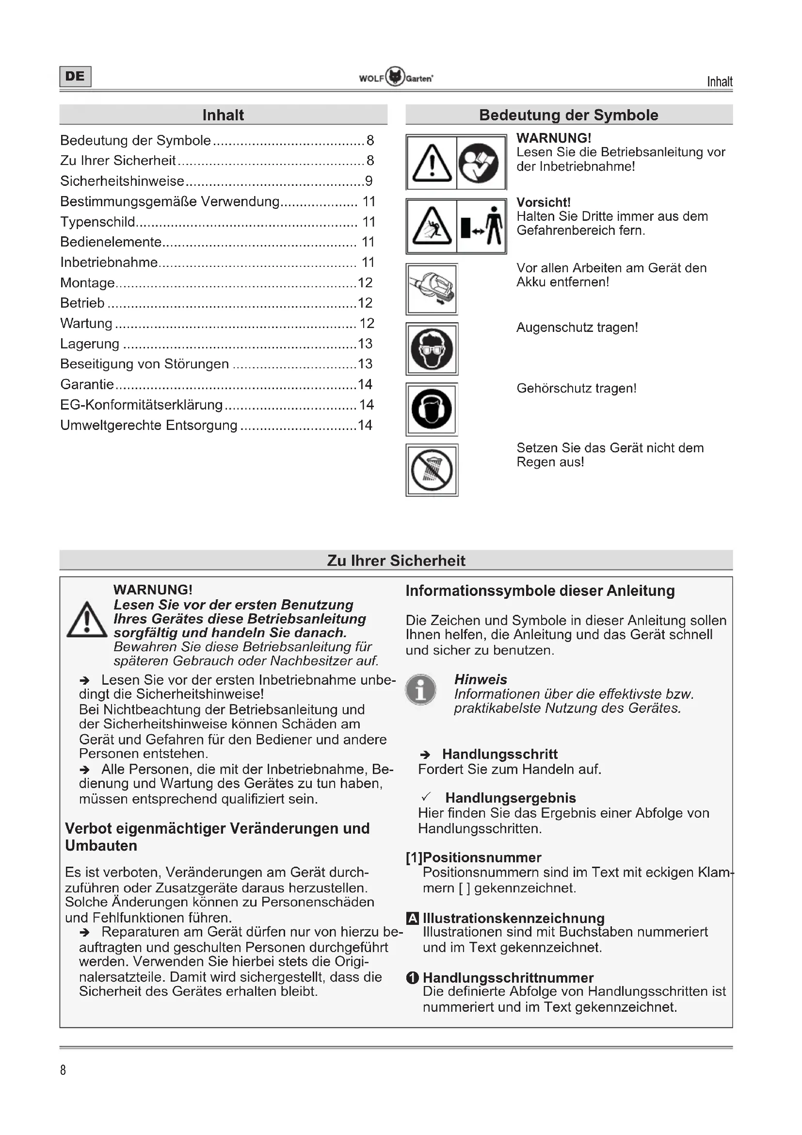 - Umweltgerechte Entsorgung Zu Ihrer Sicherheit Bedeutung der Symbole WARNUNG! Lesen Sie die Betriebsanleitung vor der Inbetriebnahme! Vorsicht! Halten Sie Dritte immer aus dem Gefahrenbereich fern. Vor allen Arbeiten am Gerät den Akku entfernen! Augenschutz tragen! Gehörschutz tragen! Setzen Sie das Gerät nicht dem Regen aus!Sicherheitshinweise p. 14