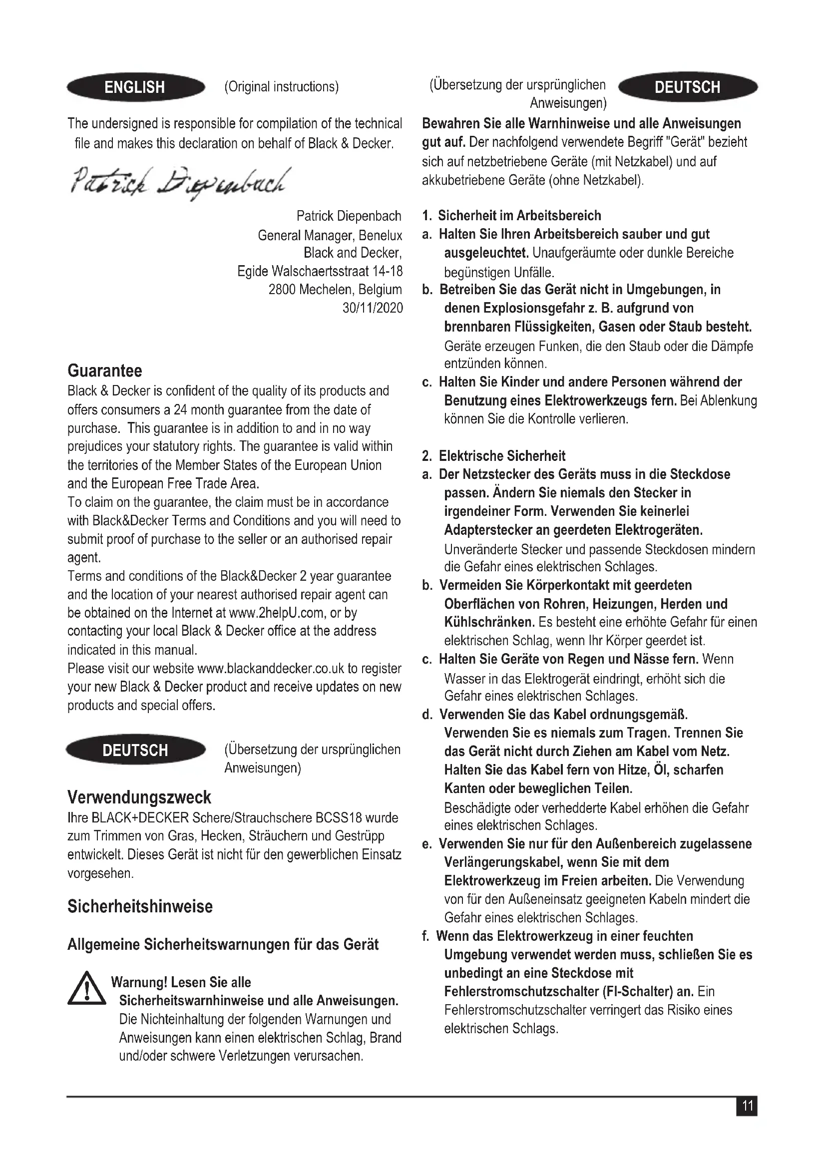 : 81,0 dB(A); K=1,4 dB(A); Declaration of Conformity The Supply of Machinery (Safety) Regulations 2008 The Noise Emission in the Environment by Equipment for use Outdoors Regulations 2001 BCSS18 Shear/Shrubber Black & Decker declares that these products described under "technical data" are in compliance with:11 (Übersetzung der ursprünglichen Anweisungen) DEUTSCH ENGLISH (Original instructions) (Übersetzung der ursprünglichen Anweisungen) DEUTSCH Verwendungszweck Ihre BLACK+DECKER Schere/Strauchschere BCSS18 wurde zum Trimmen von Gras, Hecken, Sträuchern und Gestrüpp entwickelt. Dieses Gerät ist nicht für den gewerblichen Einsatz vorgesehen. Sicherheitshinweise Allgemeine Sicherheitswarnungen für das Gerät