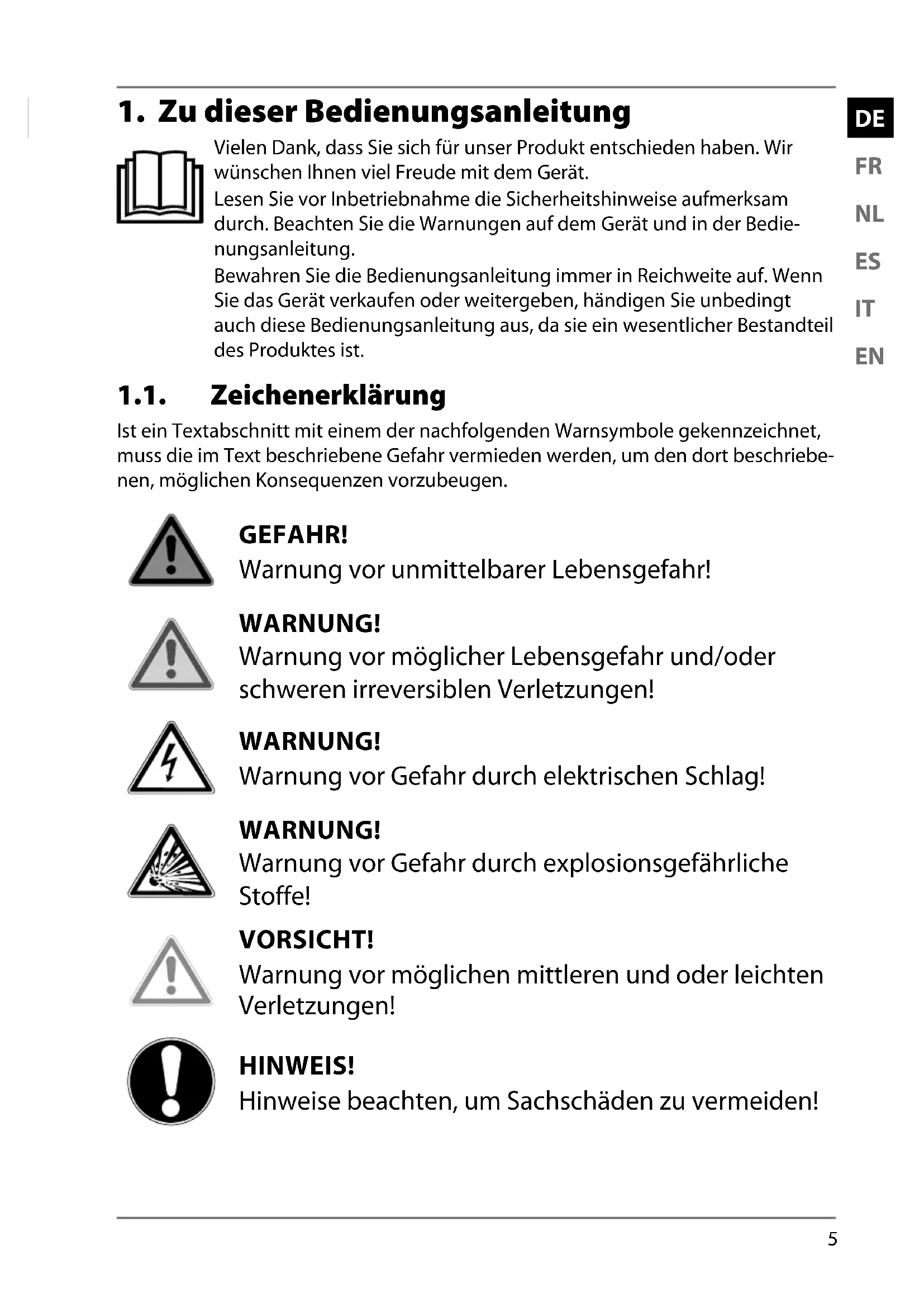 Vielen Dank, dass Sie sich für unser Produkt entschieden haben. Wir wünschen Ihnen viel Freude mit dem Gerät. Lesen Sie vor Inbetriebnahme die Sicherheitshinweise aufmerksam durch. Beachten Sie die Warnungen auf dem Gerät und in der Bedie- nungsanleitung. Bewahren Sie die Bedienungsanleitung immer in Reichweite auf. Wenn Sie das Gerät verkaufen oder weitergeben, händigen Sie unbedingt auch diese Bedienungsanleitung aus, da sie ein wesentlicher Bestandteil des Produktes ist. 1.1. Zeichenerklärung Ist ein Textabschnitt mit einem der nachfolgenden Warnsymbole gekennzeichnet, muss die im Text beschriebene Gefahr vermieden werden, um den dort beschriebe- nen, möglichen Konsequenzen vorzubeugen. GEFAHR! Warnung vor unmittelbarer Lebensgefahr! WARNUNG! Warnung vor möglicher Lebensgefahr und/oder schweren irreversiblen Verletzungen! WARNUNG! Warnung vor Gefahr durch elektrischen Schlag! WARNUNG! Warnung vor Gefahr durch explosionsgefährliche Stoffe! VORSICHT! Warnung vor möglichen mittleren und oder leichten Verletzungen! HINWEIS! Hinweise beachten, um Sachschäden zu vermeiden!6 Weiterführende Informationen für den Gebrauch des Gerätes! HINWEIS! Hinweise in der Bedienungsanleitung beachten!