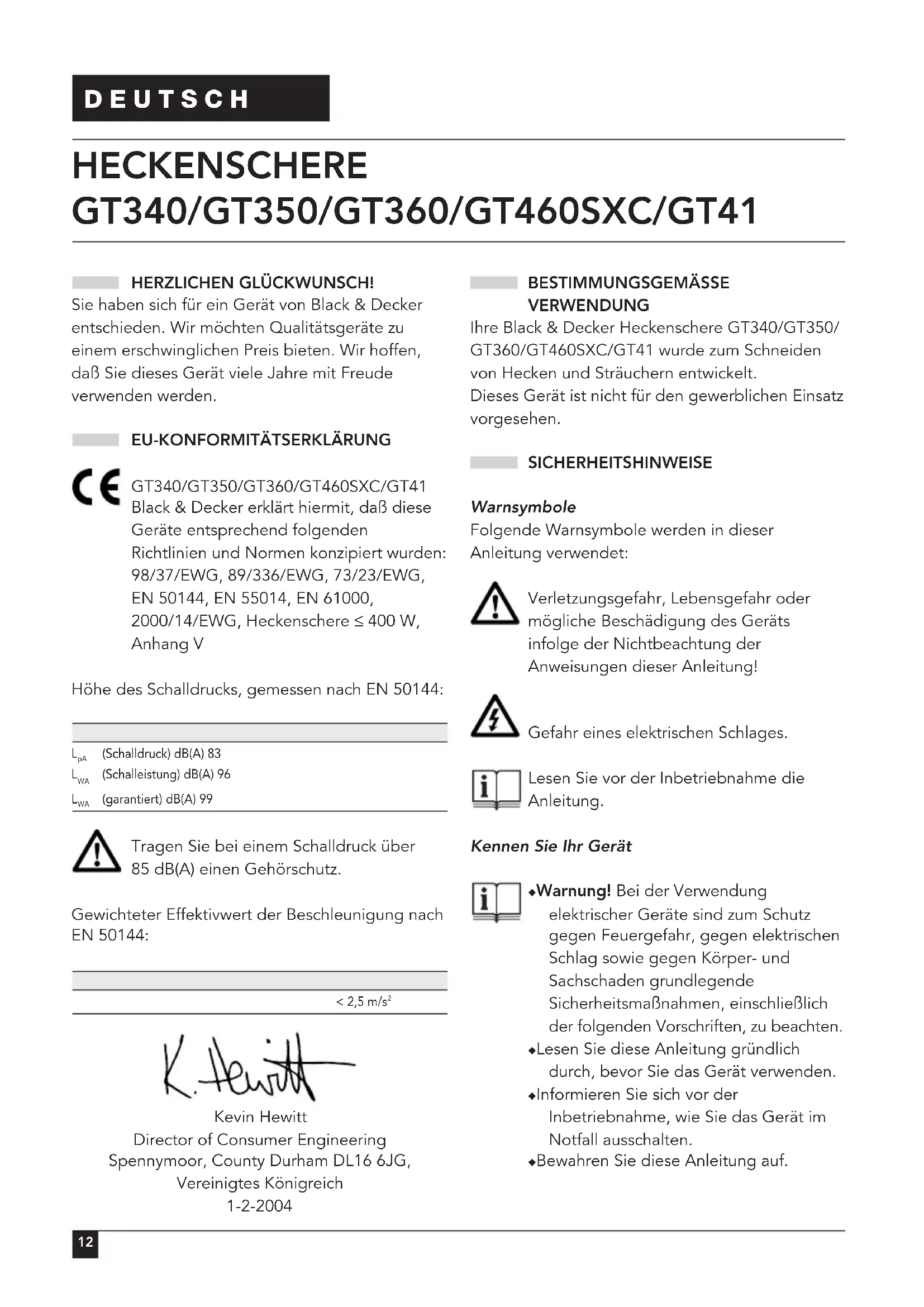 Kevin Hewitt Director of Consumer Engineering Spennymoor, County Durham DL16 6JG, Vereinigtes Königreich 1-2-2004 BESTIMMUNGSGEMÄSSE VERWENDUNG Ihre Black & Decker Heckenschere GT340/GT350/ GT360/GT460SXC/GT41 wurde zum Schneiden von Hecken und Sträuchern entwickelt. Dieses Gerät ist nicht für den gewerblichen Einsatz vorgesehen. SICHERHEITSHINWEISE Warnsymbole Folgende Warnsymbole werden in dieser Anleitung verwendet: Verletzungsgefahr, Lebensgefahr oder mögliche Beschädigung des Geräts infolge der Nichtbeachtung der Anweisungen dieser Anleitung! Gefahr eines elektrischen Schlages. Lesen Sie vor der Inbetriebnahme die Anleitung. Kennen Sie Ihr Gerät ◆ Warnung! Bei der Verwendung elektrischer Geräte sind zum Schutz gegen Feuergefahr, gegen elektrischen Schlag sowie gegen Körper- und Sachschaden grundlegende Sicherheitsmaßnahmen, einschließlich der folgenden Vorschriften, zu beachten. ◆ Lesen Sie diese Anleitung gründlich durch, bevor Sie das Gerät verwenden. ◆ Informieren Sie sich vor der Inbetriebnahme, wie Sie das Gerät im Notfall ausschalten. ◆ Bewahren Sie diese Anleitung auf.13 DEUTSCH Allgemeines