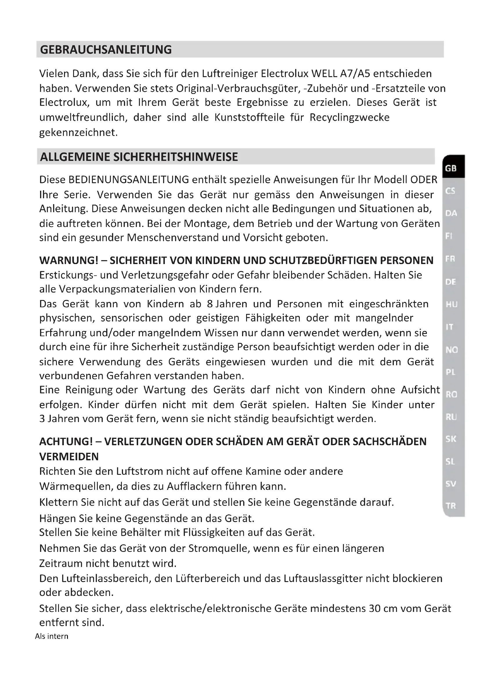 Vielen Dank, dass Sie sich für den Luftreiniger Electrolux WELL A7/A5 entschieden haben. Verwenden Sie stets Original-Verbrauchsgüter, -Zubehör und -Ersatzteile von Electrolux, um mit Ihrem Gerät beste Ergebnisse zu erzielen. Dieses Gerät ist umweltfreundlich, daher sind alle Kunststoffteile für Recyclingzwecke gekennzeichnet. ALLGEMEINE SICHERHEITSHINWEISE