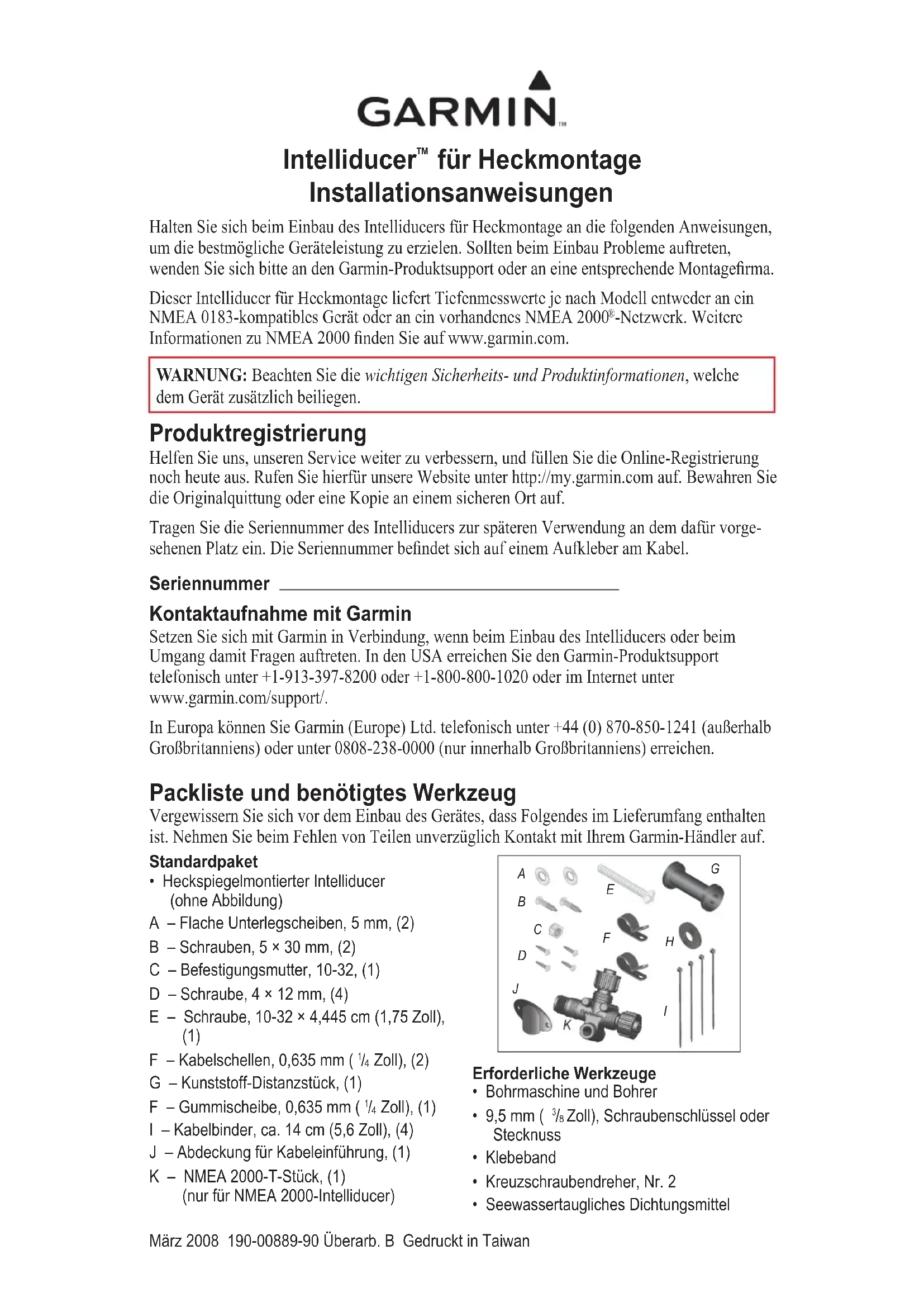 Zoll) Tiefe Gewicht: 624 g (22 oz) Kabel: NMEA 2000: 6 m (19 Fuß, 8 Zoll) NMEA 0183-Stromversorgungs-/Datenkabel: 9 m (29 Fuß, 6 Zoll) Temperaturbereich: -15 °C bis 33 °C (5 °F bis 91 °F) Gehäusewerkstoff: ASA-Kunststoff Taste POWER Stromversorgungsquelle: NMEA 2000 - 9 bis 16 V Gleichspannung NMEA 0183: 9 bis 33 V Gleichspannung Sicherung: 2 A Leistungsaufnahme: max. 2 W NMEA 2000, LEN-Wert (Gerätestromaufnahme): 4 Echolot Stromversorgung: 150 W (eff.), 1.200 W (Spitze-Spitze) Frequenz: 160 kHz Tiefe: 900 Fuß (275 m) (Das Tiefenmessvermögen hängt vom Salzgehalt des Wassers, von der Beschaffenheit des Bodens und anderen Wasserbedingungen ab) NMEA 2000-PGN-Informationen Der NMEA 2000-Heckspiegel-Intelliducer überträgt die folgenden PGN-Informationen an das NMEA 2000-Netzwerk: 059392 ISO-Zulassung 060928 ISO-Adressenanforderung 126208 Gruppenfunktion NMEA – Befehl/Anforderung/Bestätigung 126464 Gruppenfunktion PGN-Listen senden/empfangen 126996 Produktinformation 128267 Wassertiefe 130312 Temperatur Garmin-Intelliducer sind nach NMEA 2000 zertiziert. NMEA 0183-Informationen Der NMEA 0183-Heckspiegel-Intelliducer kommuniziert mit NMEA 0183-Geräten und verwendet dazu die NMEA 0183-Sätze SDDPT, SDDBT und SDMTW.23Einbauanweisungen Intelliducer für Heckmontage Software-Lizenzvereinbarung DURCH DIE VERWENDUNG DES GERÄTES STIMMEN SIE ZU, AN DIE BEDINGUNGEN DER FOLGENDEN SOFTWARE-LIZENZVEREINBARUNG GEBUNDEN ZU SEIN. LESEN SIE DIE LIZENZVEREINBARUNG AUFMERKSAM DURCH. Garmin gewährt Ihnen eine beschränkte Lizenz zur Verwendung der Software auf diesem Gerät (die „Software“) im Binärformat im Rahmen des normalen Betriebs dieses Geräts. Verfügungsrechte, Eigentumsrechte und geistige Eigentumsrechte an der Software verbleiben bei Garmin. Sie erkennen an, dass die Software Eigentum von Garmin ist und durch die Urheberrechte der Vereinigten Staaten von Amerika und internationale Abkommen zum Urheberrecht geschützt ist. Weiterhin erkennen Sie an, dass Struktur, Organisation und Code der Software wertvolle Betriebsgeheimnisse von Garmin sind und dass der Quellcode der Software ein wertvolles Betriebsgeheimnis von Garmin bleibt. Sie erklären sich bereit, die Software oder Teile davon nicht zu dekompilieren, zu deassemblieren, zu verändern, zurückzuassemblieren, mittels Reverse Engineering zu bearbeiten, in eine allgemein lesbare Form umzuwandeln oder ein von der Software abgeleitetes Produkt zu erzeugen. Sie verpichten sich, die Software nicht in ein Land zu exportieren oder zu re-exportieren, das nicht im Einklang mit den Exportkontrollgesetzen der USA steht. Konformitätserklärung Garmin erklärt hiermit, dass dieser Intelliducer den wesentlichen Anforderungen und weiteren relevanten Vorschriften der Richtlinie 1999/5/EG entspricht. Sie nden die vollständige Konformitätserklärung auf der Garmin-Website für Ihr Garmin-Produkt: www.garmin.com/products/intelliducer/. Klicken Sie auf Handbücher und dann auf den Link Konformitätserklärung.© Copyright 2008 Garmin Ltd. oder deren Tochtergesellschaften Garmin International, Inc. 1200 E 151st Street, Olathe, Kansas 66062 USA Tel.: +1-913-397-8200 Fax: +1-913-397-8282 Garmin (Europe) Ltd Liberty House, Hounsdown Business Park, Southampton, Hampshire, SO40 9RB UK. Tel.: 44/0870.8501241 (außerhalb von Großbritannien) oder 0808 2380000 (nur Großbritannien) Fax: +44 (0) 870-850-1251 Garmin Corporation No. 68, Jangshu 2nd Road, Shijr, Taipei County, Taiwan Tel.: 886-226-42-9199 Fax: +886-2-2642-9099 Teilenummer 190-00889-90 Überarb. B © 2008 Garmin Ltd. oder Tochterunternehmen Alle Rechte vorbehalten. Sofern in dieser Vereinbarung nichts anderes bestimmt ist, darf ohne vorherige ausdrückliche schriftliche Genehmigung durch Garmin kein Teil dieses Handbuchs zu irgendeinem Zweck reproduziert, kopiert, übertragen, weitergegeben, heruntergeladen oder auf Speichermedien jeglicher Art gespeichert werden. Garmin genehmigt hiermit, dass eine einzige Kopie dieses Handbuchs auf eine Festplatte oder ein anderes elektronisches Speichermedium zur Ansicht heruntergeladen und eine Kopie dieses Handbuchs oder der Überarbeitungen dieses Handbuchs ausgedruckt werden kann, vorausgesetzt, diese elektronische Kopie oder Druckversion enthält den vollständigen Text des vorliegenden Copyright-Hinweises; darüber hinaus ist jeglicher unbefugte kommerzielle Vertrieb dieses Handbuchs oder einer Überarbeitung des Handbuchs strengstens verboten. Die Informationen im vorliegenden Dokument können ohne Ankündigung geändert werden. Garmin behält sich das Recht vor, Änderungen und Verbesserungen an seinen Produkten vorzunehmen und den Inhalt zu ändern, ohne Personen oder Organisationen über solche Änderungen oder Verbesserungen informieren zu müssen. Auf der Garmin-Website (www.garmin.com) nden Sie aktuelle Updates sowie zusätzliche Informationen zu Verwendung und Betrieb dieses und anderer Garmin-Produkte. Garmin