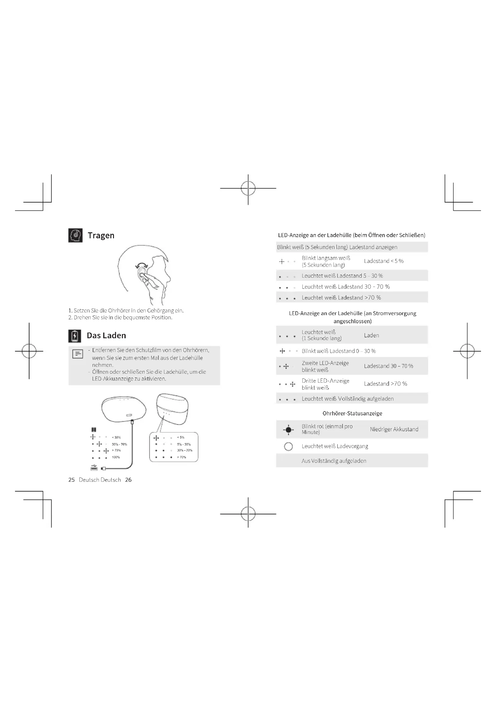 Das Laden - Entfernen Sie den Schutzfilm von den Ohrhörern, wenn Sie sie zum ersten Mal aus der Ladehülle nehmen. - Öffnen oder schließen Sie die Ladehülle, um die LED-Akkuanzeige zu aktivieren. < 30% 30% - 70% > 70% 100% 5% - 30% < 5% 30% - 70% > 70% LED-Anzeige an der Ladehülle (beim Öffnen oder Schließen) Blinkt weiß (5 Sekunden lang) Ladestand anzeigen Blinkt langsam weiß (5 Sekunden lang) Ladestand < 5 % Leuchtet weiß Ladestand 5 – 30 % Leuchtet weiß Ladestand 30 – 70 % Leuchtet weiß Ladestand >70 % LED-Anzeige an der Ladehülle (an Stromversorgung angeschlossen) Leuchtet weiß (1 Sekunde lang) Laden Blinkt weiß Ladestand 0 – 30 % Zweite LED-Anzeige blinkt weiß Ladestand 30 – 70 % Dritte LED-Anzeige blinkt weiß Ladestand >70 % Leuchtet weiß Vollständig aufgeladen Ohrhörer-Statusanzeige Blinkt rot (einmal pro Minute) Niedriger Akkustand Leuchtet weiß Ladevorgang Aus Vollständig aufgeladen27 Deutsch Deutsch 28 Um die Akkulebensdauer zu bewahren, mindestens alle 45 Tage vollständig laden. Ein- / Ausschalten