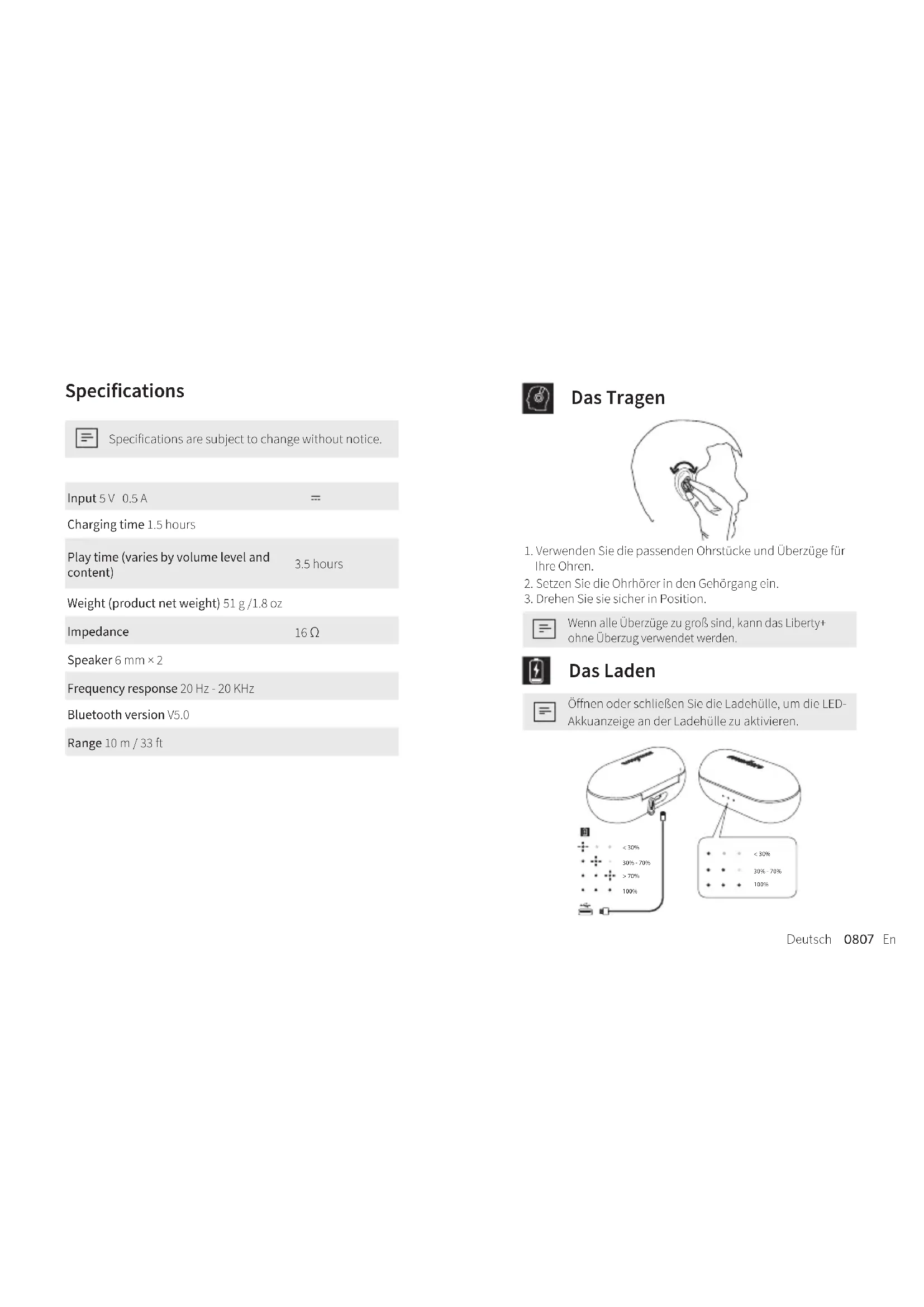 Wenn alle Überzüge zu groß sind, kann das Liberty+ ohne Überzug verwendet werden. Das Laden Öffnen oder schließen Sie die Ladehülle, um die LED- Akkuanzeige an der Ladehülle zu aktivieren. < 30% 30% - 70% > 70% 100% < 30% 30% - 70% 100% Specifications Specifications are subject to change without notice. Input 5 V 0.5 A Charging time 1.5 hours Play time (varies by volume level and content)