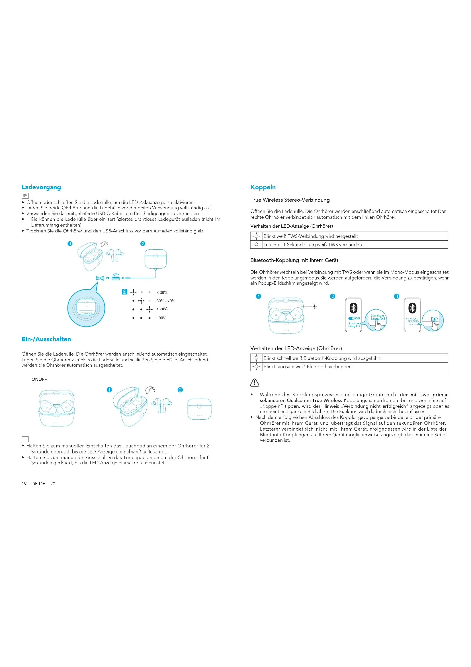- Nach dem erfolgreichen Abschluss des Kopplungsvorgangs verbindet sich der primäre Ohrhörer mit Ihrem Gerät und übertragt das Signal auf den sekundären Ohrhörer. Letzterer verbindet sich nicht mit Ihrem Gerät.Infolgedessen wird in der Liste der Bluetooth-Kopplungen auf Ihrem Gerät möglicherweise angezeigt, dass nur eine Seite verbunden ist.21 DE DE 22 Legen Sie die Ohrhörer zum Koppeln mit einem anderen Bluetooth-Gerät wieder in die Ladehülle und stellen Sie sicher, dass sie aufgeladen werden. Lassen Sie die Hülle geöffnet und halten Sie anschließend die Taste unten an der Ladehülle für 3 Sekunden gedrückt, bis die LED-Anzeigen an den Ohrhörern schnell weiß blinken.