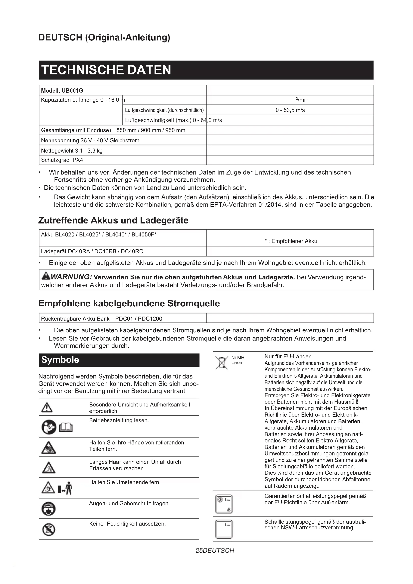 - LesenSievorGebrauchderkabelgebundenenStromquellediedaranangebrachtenAnweisungenund Warnmarkierungen durch. Symbole NachfolgendwerdenSymbolebeschrieben,diefürdas Gerätverwendetwerdenkönnen.MachenSiesichunbe- dingt vor der Benutzung mit ihrer Bedeutung vertraut. Besondere Umsicht und Aufmerksamkeit erforderlich. Betriebsanleitunglesen. Halten Sie Ihre Hände von rotierenden Teilen fern. Langes Haar kann einen Unfall durch Erfassenverursachen. Halten Sie Umstehende fern. Augen- und Gehörschutz tragen. KeinerFeuchtigkeitaussetzen. Ni-MH Li-ion NurfürEU-Länder Aufgrund des Vorhandenseins gefährlicher KomponenteninderAusrüstungkönnenElektro- undElektronik-Altgeräte,Akkumulatorenund Batterien sich negativ auf die Umwelt und die menschliche Gesundheit auswirken. EntsorgenSieElektro-undElektronikgeräte oderBatteriennichtmitdemHausmüll! InÜbereinstimmungmitderEuropäischen RichtlinieüberElektro-undElektronik- Altgeräte, Akkumulatoren und Batterien, verbrauchteAkkumulatorenund Batterien sowie ihrer Anpassung an nati- onalesRechtsolltenElektro-Altgeräte, BatterienundAkkumulatorengemäßden Umweltschutzbestimmungengetrenntgela- gert und zu einer getrennten Sammelstelle fürSiedlungsabfällegeliefertwerden. DieswirddurchdasamGerätangebrachte SymbolderdurchgestrichenenAbfalltonne auf Rädern angezeigt. GarantierterSchallleistungspegelgemäß derEU-RichtlinieüberAußenlärm. Schallleistungspegelgemäßderaustrali- schen NSW-Lärmschutzverordnung26 DEUTSCH Vorgesehene Verwendung DieMaschineistfürdasWegblasenvonStaub vorgesehen. Geräusch TypischerA-bewerteterGeräuschpegelermitteltgemäß EN50636-2-100: Schalldruckpegel (L