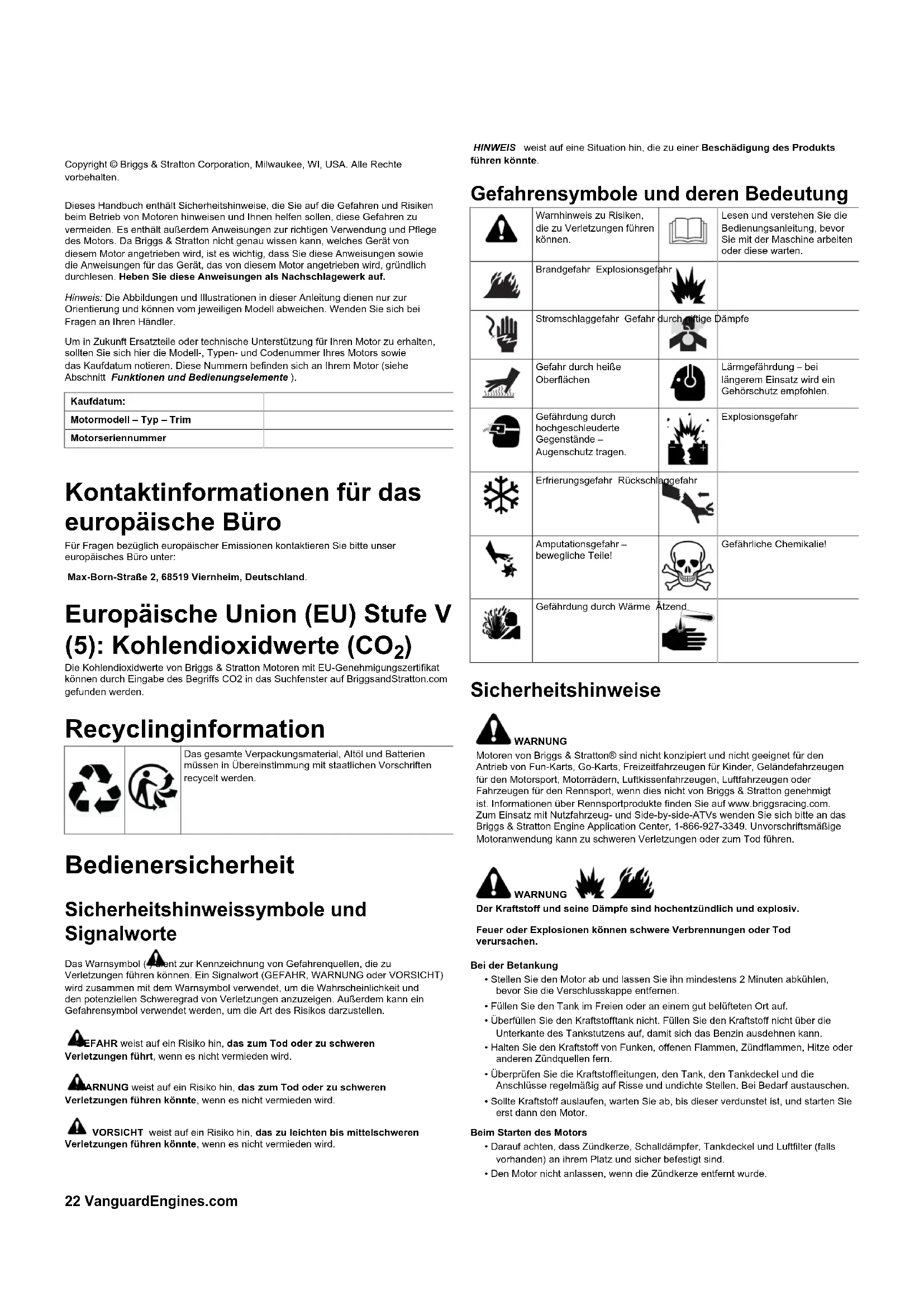 opbevaring på lager eller forkert motorinstallation. Servicegarantien er kun tilgængelig via autoriserede Briggs & Stratton- serviceforhandlere. Find din nærmeste serviceforhandler på vores forhandlerkort på BRIGGSandSTRATTON.COM, eller ved at ringe til 1-800-233-3723 (i USA). 80004537 (Rev. F)22 VanguardEngines.com Copyright © Briggs & Stratton Corporation, Milwaukee, WI, USA. Alle Rechte vorbehalten. Dieses Handbuch enthält Sicherheitshinweise, die Sie auf die Gefahren und Risiken beim Betrieb von Motoren hinweisen und Ihnen helfen sollen, diese Gefahren zu vermeiden. Es enthält außerdem Anweisungen zur richtigen Verwendung und Pflege des Motors. Da Briggs & Stratton nicht genau wissen kann, welches Gerät von diesem Motor angetrieben wird, ist es wichtig, dass Sie diese Anweisungen sowie die Anweisungen für das Gerät, das von diesem Motor angetrieben wird, gründlich durchlesen.Heben Sie diese Anweisungen als Nachschlagewerk auf. Hinweis:Die Abbildungen und Illustrationen in dieser Anleitung dienen nur zur Orientierung und können vom jeweiligen Modell abweichen. Wenden Sie sich bei Fragen an Ihren Händler. Um in Zukunft Ersatzteile oder technische Unterstützung für Ihren Motor zu erhalten, sollten Sie sich hier die Modell-, Typen- und Codenummer Ihres Motors sowie das Kaufdatum notieren. Diese Nummern befinden sich an Ihrem Motor (siehe AbschnittFunktionen und Bedienungselemente). Kaufdatum: Motormodell – Typ – Trim Motorseriennummer Kontaktinformationen für das europäische Büro Für Fragen bezüglich europäischer Emissionen kontaktieren Sie bitte unser europäisches Büro unter: Max-Born-Straße 2, 68519 Viernheim, Deutschland. Europäische Union (EU) Stufe V (5): Kohlendioxidwerte (CO
