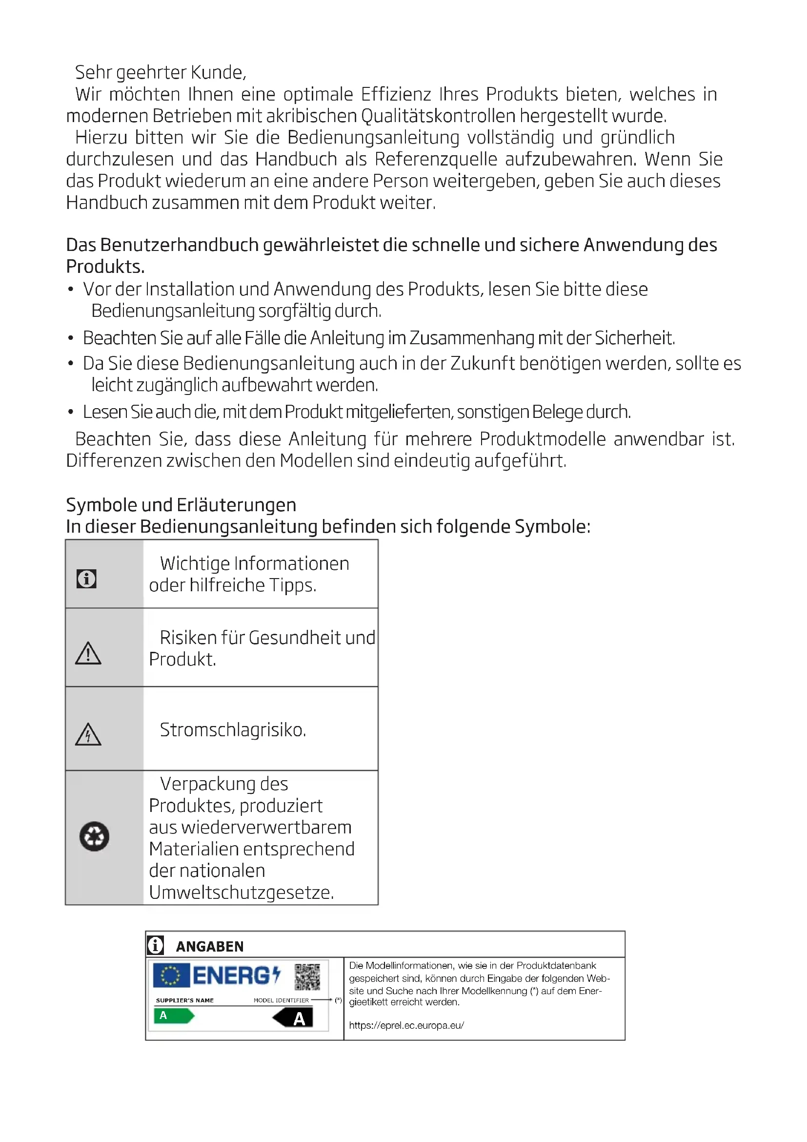 Die Modellinformationen, wie sie in der Produktdatenbank gespeichert sind, können durch Eingabe der folgenden Web-site und Suche nach Ihrer Modellkennung (*) auf dem Ener-gieetikett erreicht werden.https://eprel.ec.europa.eu/