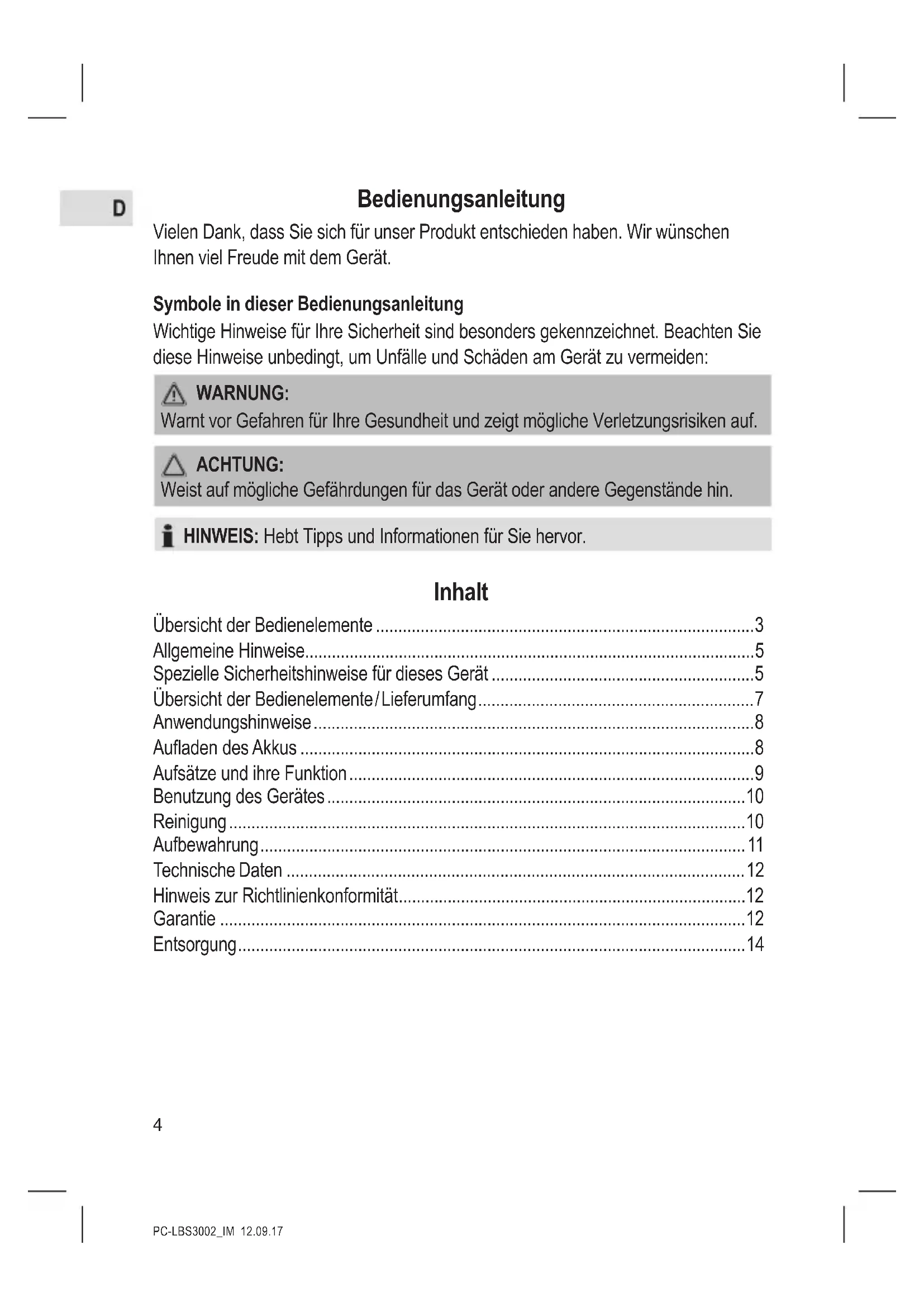 - Zugang zu unseren Zubehör- und Ersatzteile-Web shops Auch nach der Garantie sind wir für Sie da! – Kostengünstige Reparaturen zum Festpreis! Bitte nehmen Sie in keinem Fall eine unfreie Einsendung Ihres Gerätes vor. Unfreie Lieferungen werden von uns nicht angenommen. Es entstehen Ihnen damit erhebli- che Kosten. Stand 06 2012 Entsorgung Akku- / Batterieentsorgung Das Gerät enthält einen wiederauadbaren Akku. Verbrauchte Batte- rien / Akkumulatoren (Akkus) gehören nicht in den Hausmüll. Der Akku muss entnommen werden, bevor das Produkt entsorgt wird. Wenden Sie sich hierfür an qualiziertes Fachpersonal. Informationen, wo Batterien / Akkus zu entsorgen sind, erhalten Sie über Ihre Kommunen oder die Gemeindeverwaltungen.PC-LBS3002_IM 12.09.17