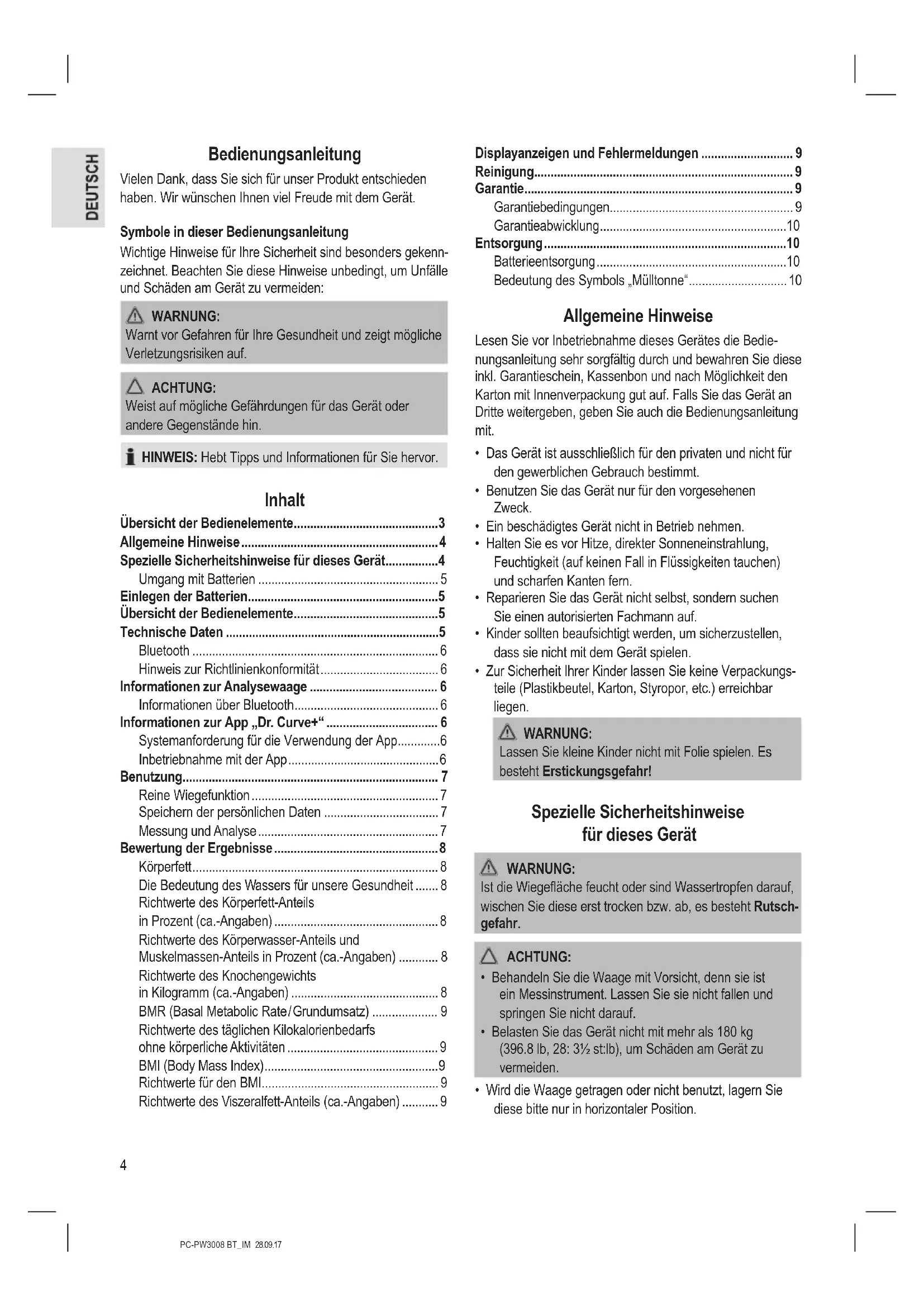 - Wird die Waage getragen oder nicht benutzt, lagern Sie diese bitte nur in horizontaler Position.5 PC-PW3008 BT_IM 28.09.17