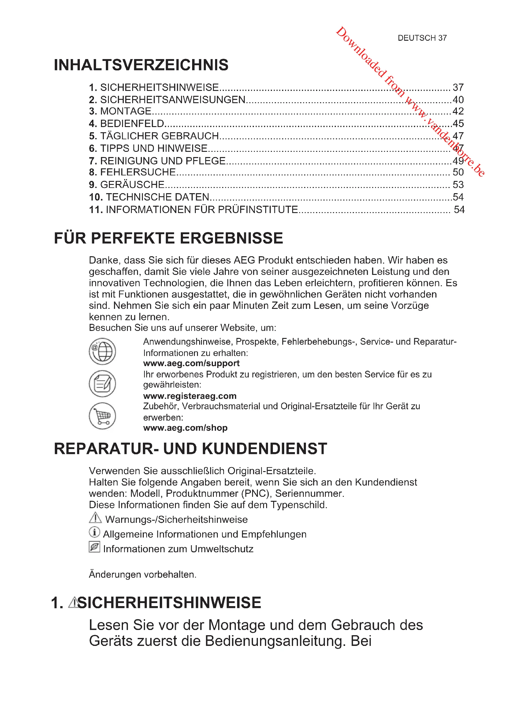 - Das Gerät muss geerdet sein. Zu diesem Zweck ist der Netzstecker mit einem Schutzkontakt ausgestattet. Falls die Steckdose Ihres Hausanschlusses nicht geerdet sein sollte, lassen Sie das Gerät gemäß den geltenden Vorschriften von einem qualifizierten Elektriker erden. www.aeg.com44 Downloaded from www.vandenborre.be• Der Hersteller übernimmt keinerlei Haftung bei Missachtung der vorstehenden Sicherheitshinweise.