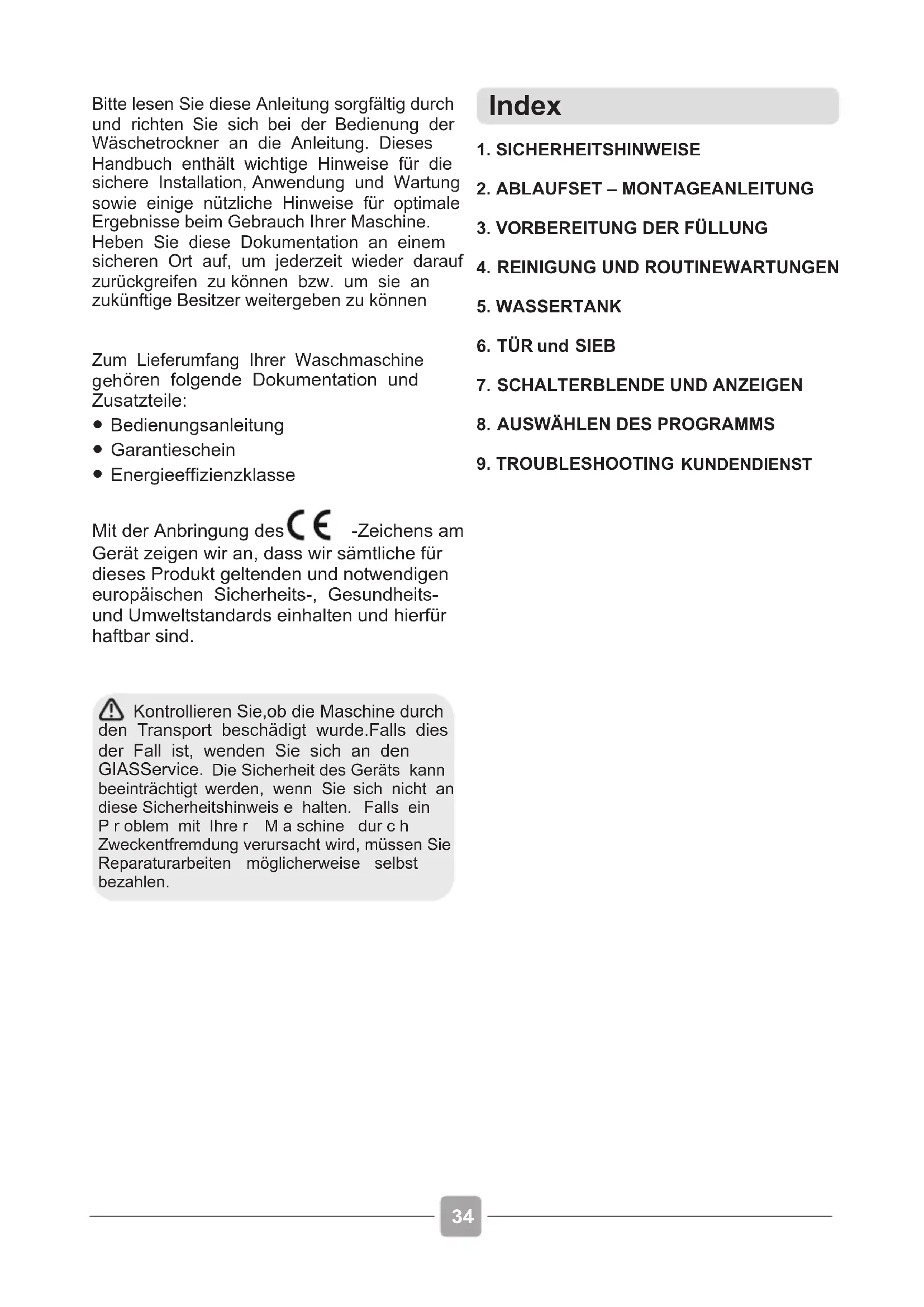 Mit der Anbringung des -Zeichens am Gerät zeigen wir an, dass wir sämtliche für dieses Produkt geltenden und notwendigen europäischen Sicherheits-, Gesundheits- und Umweltstandards einhalten und hierfür haftbar sind. 1. SICHERHEITSHINWEISE2. ABLAUFSET – MONTAGEANLEITUNG3. VORBEREITUNG DER FÜLLUNGREINIGUNG UND ROUTINEWARTUNGEN5. WASSERTANKTÜR SIEBSCHALTERBLENDE UND ANZEIGENAUSWÄHLEN DES PROGRAMMS9. TROUBLESHOOTING