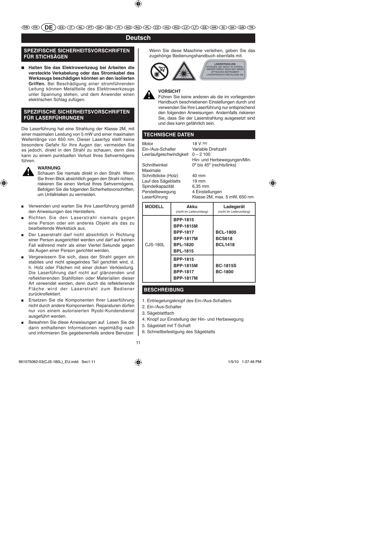 Verwenden und warten Sie Ihre Laserführung gemäß den Anweisungen des Herstellers. Richten Sie den Laserstrahl niemals gegen eine Person oder ein anderes Objekt als das zu bearbeitende Werkstück aus. Der Laserstrahl darf nicht absichtlich in Richtung einer Person ausgerichtet werden und darf auf keinen Fall während mehr als einer Viertel Sekunde gegen die Augen einer Person gerichtet werden. Vergewissern Sie sich, dass der Strahl gegen ein stabiles und nicht spiegelndes Teil gerichtet wird, d. h. Holz oder Flächen mit einer dicken Verkleidung. Die Laserführung darf nicht auf glänzenden und reflektierenden Stahlfolien oder Materialien dieser Art verwendet werden, denn durch die reflektierende Fläche wird der Laserstrahl zum Bediener zurückreflektiert. Ersetzen Sie die Komponenten Ihrer Laserführung nicht durch andere Komponenten. Reparaturen dürfen nur von einem autorisierten Ryobi-Kundendienst ausgeführt werden. Bewahren Sie diese Anweisungen auf. Lesen Sie die darin enthaltenen Informationen regelmäßig nach und informieren Sie gegebenenfalls andere Benutzer. MODELL CJS-180L Akku Ladegerät (nicht im Lieferumfang) (nicht im Lieferumfang) BPP-1815 BPP-1815M BPP-1817 BPP-1817M BPL-1820 BPL-1815 BPP-1815 BPP-1815M BPP-1817 BPP-1817M BCL-1800 BCS618 BCL1418 BC-1815S BC-1800 BESCHREIBUNG