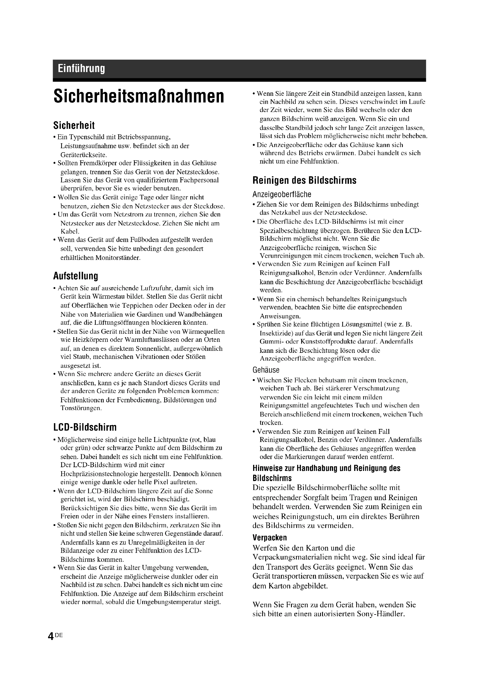 - Verwenden Sie zum Reinigen auf keinen Fall Reinigungsalkohol, Benzin oder Verdünner. Andernfalls kann die Oberfläche des Gehäuses angegriffen werden oder die Markierungen darauf werden entfernt. Hinweise zur Handhabung und Reinigung des Bildschirms Die spezielle Bildschirmoberfläche sollte mit entsprechender Sorgfalt beim Tragen und Reinigen behandelt werden. Verwenden Sie zum Reinigen ein weiches Reinigungstuch, um ein direktes Berühren des Bildschirms zu vermeiden. Verpacken Werfen Sie den Karton und die Verpackungsmaterialien nicht weg. Sie sind ideal für den Transport des Geräts geeignet. Wenn Sie das Gerät transportieren müssen, verpacken Sie es wie auf dem Karton abgebildet. Wenn Sie Fragen zu dem Gerät haben, wenden Sie sich bitte an einen autorisierten Sony-Händler. Einführung5