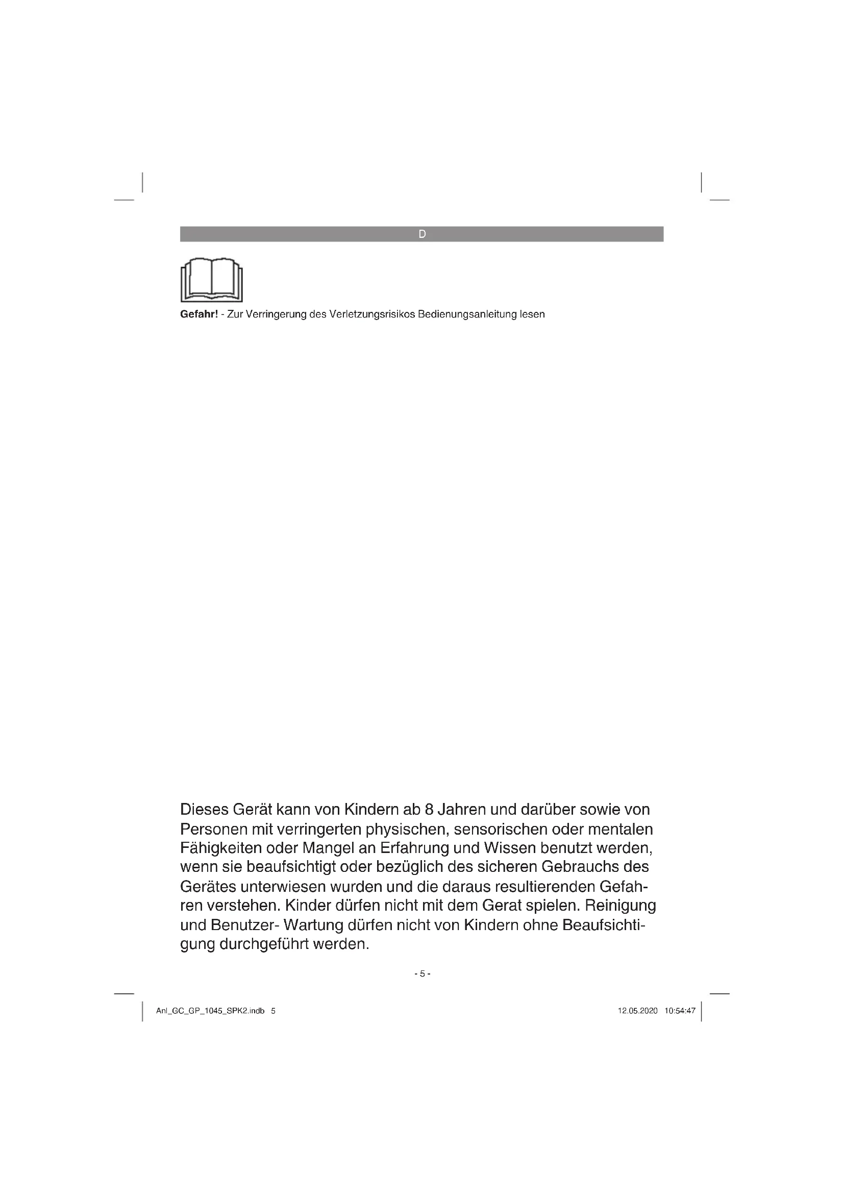 Dieses Gerät kann von Kindern ab 8 Jahren und darüber sowie von Personen mit verringerten physischen, sensorischen oder mentalen Fähigkeiten oder Mangel an Erfahrung und Wissen benutzt werden, wenn sie beaufsichtigt oder bezüglich des sicheren Gebrauchs des Gerätes unterwiesen wurden und die daraus resultierenden Gefah- ren verstehen. Kinder dürfen nicht mit dem Gerat spielen. Reinigung und Benutzer- Wartung dürfen nicht von Kindern ohne Beaufsichti- gung durchgeführt werden. Gefahr! - Zur Verringerung des Verletzungsrisikos Bedienungsanleitung lesen Anl_GC_GP_1045_SPK2.indb 5Anl_GC_GP_1045_SPK2.indb 5 12.05.2020 10:54:4712.05.2020 10:54:47D
