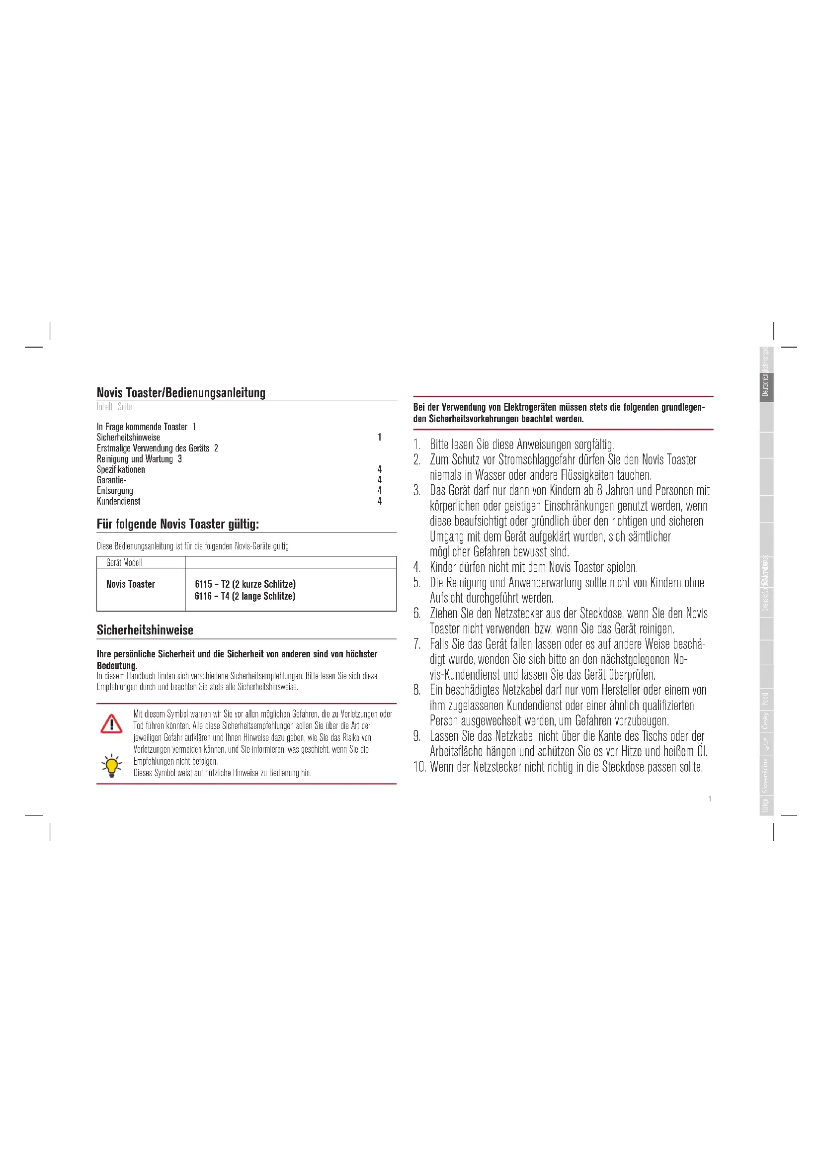 Novis Toaster/Bedienungsanleitung Inhalt Seite In Frage kommende Toaster 1 Sicherheitshinweise 1 Erstmalige Verwendung des Geräts 2 Reinigung und Wartung 3 Spezifikationen 4 Garantie- 4 Entsorgung 4 Kundendienst 4 Für folgende Novis Toaster gültig: Diese Bedienungsanleitung ist für die folgenden Novis-Geräte gültig: Gerät Modell Novis Toaster 6115 – T2 (2 kurze Schlitze) 6116 – T4 (2 lange Schlitze) Sicherheitshinweise Ihre persönliche Sicherheit und die Sicherheit von anderen sind von höchster Bedeutung. In diesem Handbuch finden sich verschiedene Sicherheitsempfehlungen. Bitte lesen Sie sich diese Empfehlungen durch und beachten Sie stets alle Sicherheitshinsweise. Mit diesem Symbol warnen wir Sie vor allen möglichen Gefahren, die zu Verletzungen oder Tod führen könnten. Alle diese Sicherheitsempfehlungen sollen Sie über die Art der jeweiligen Gefahr aufklären und Ihnen Hinweise dazu geben, wie Sie das Risiko von Verletzungen vermeiden können, und Sie informieren, was geschieht, wenn Sie die Empfehlungen nicht befolgen. Dieses Symbol weist auf nützliche Hinweise zu Bedienung hin. Bei der Verwendung von Elektrogeräten müssen stets die folgenden grundlegen- den Sicherheitsvorkehrungen beachtet werden.