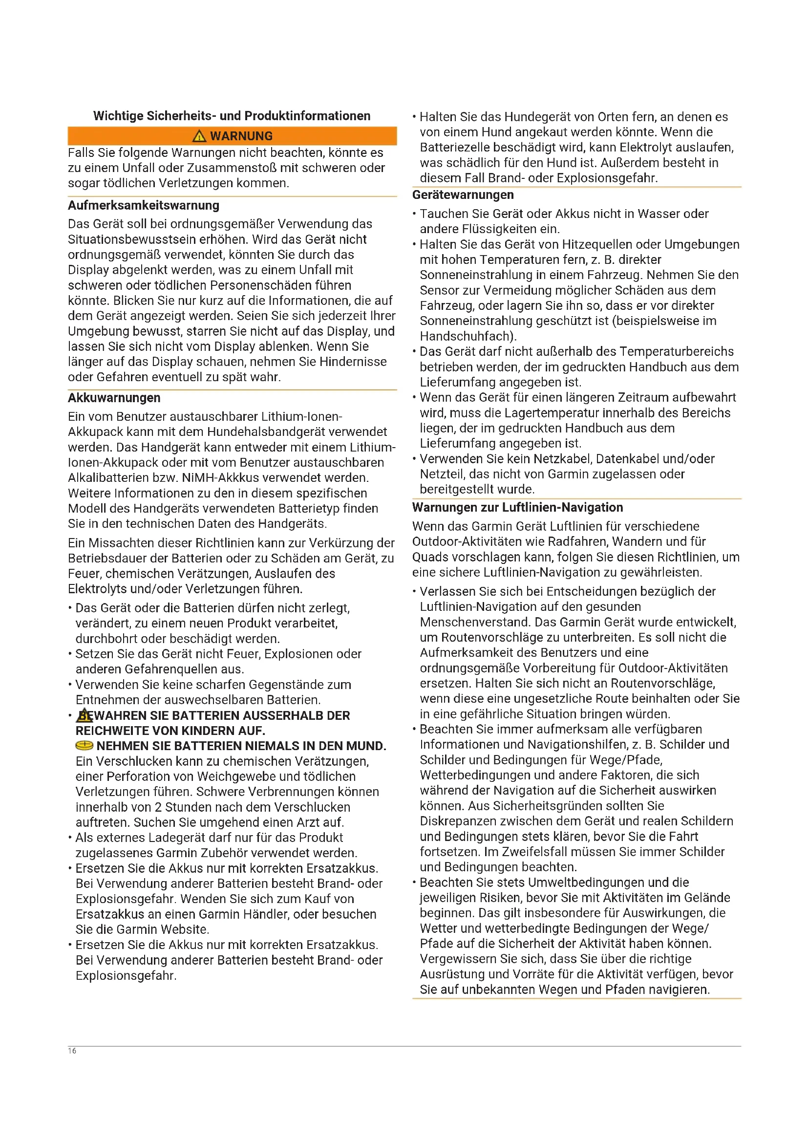 - Verlassen Sie sich bei Entscheidungen bezüglich der Luftlinien-Navigation auf den gesunden Menschenverstand. Das Garmin Gerät wurde entwickelt, um Routenvorschläge zu unterbreiten. Es soll nicht die Aufmerksamkeit des Benutzers und eine ordnungsgemäße Vorbereitung für Outdoor-Aktivitäten ersetzen. Halten Sie sich nicht an Routenvorschläge, wenn diese eine ungesetzliche Route beinhalten oder Sie in eine gefährliche Situation bringen würden.