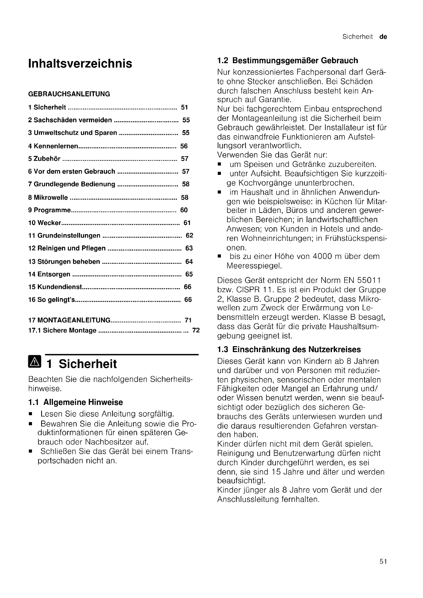 1 Sicherheit Beachten Sie die nachfolgenden Sicherheits- hinweise. 1.1 Allgemeine Hinweise ¡ Lesen Sie diese Anleitung sorgfältig. ¡ Bewahren Sie die Anleitung sowie die Pro- duktinformationen für einen späteren Ge- brauch oder Nachbesitzer auf. ¡ Schließen Sie das Gerät bei einem Trans- portschaden nicht an. 1.2 Bestimmungsgemäßer Gebrauch Nur konzessioniertes Fachpersonal darf Gerä- te ohne Stecker anschließen. Bei Schäden durch falschen Anschluss besteht kein An- spruch auf Garantie. Nur bei fachgerechtem Einbau entsprechend der Montageanleitung ist die Sicherheit beim Gebrauch gewährleistet. Der Installateur ist für das einwandfreie Funktionieren am Aufstel- lungsort verantwortlich. Verwenden Sie das Gerät nur: ¡ um Speisen und Getränke zuzubereiten. ¡ unter Aufsicht. Beaufsichtigen Sie kurzzeiti- ge Kochvorgänge ununterbrochen. ¡ im Haushalt und in ähnlichen Anwendun- gen wie beispielsweise: in Küchen für Mitar- beiter in Läden, Büros und anderen gewer- blichen Bereichen; in landwirtschaftlichen Anwesen; von Kunden in Hotels und ande- ren Wohneinrichtungen; in Frühstückspensi- onen. ¡ bis zu einer Höhe von 4000m über dem Meeresspiegel. Dieses Gerät entspricht der Norm EN 55011 bzw. CISPR 11. Es ist ein Produkt der Gruppe 2, Klasse B. Gruppe 2 bedeutet, dass Mikro- wellen zum Zweck der Erwärmung von Le- bensmitteln erzeugt werden. Klasse B besagt, dass das Gerät für die private Haushaltsum- gebung geeignet ist. 1.3 Einschränkung des Nutzerkreises Dieses Gerät kann von Kindern ab 8 Jahren und darüber und von Personen mit reduzier- ten physischen, sensorischen oder mentalen Fähigkeiten oder Mangel an Erfahrung und/ oder Wissen benutzt werden, wenn sie beauf- sichtigt oder bezüglich des sicheren Ge- brauchs des Geräts unterwiesen wurden und die daraus resultierenden Gefahren verstan- den haben. Kinder dürfen nicht mit dem Gerät spielen. Reinigung und Benutzerwartung dürfen nicht durch Kinder durchgeführt werden, es sei denn, sie sind 15 Jahre und älter und werden beaufsichtigt. Kinder jünger als 8 Jahre vom Gerät und der Anschlussleitung fernhalten.de Sicherheit