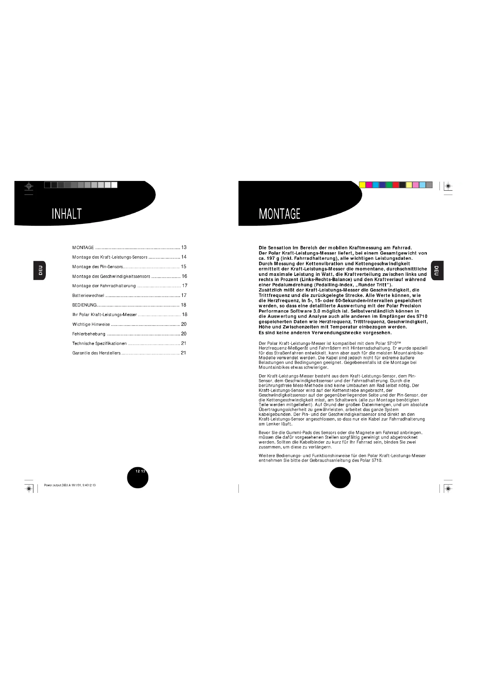 - If there is no cadence reading, check the correct position of the power sensor with the crank magnet. Power.output.GBR A 18/1/01, 9:3510-1112 13 DEU DEU MONTAGE MONTAGE ....................................................................... 13 Montage des Kraft-Leistungs-Sensors .......................... 14 Montage des Pin-Sensors............................................... 15Montage des Geschwindigkeitssensors ........................ 16Montage der Fahrradhalterung .................................... 17 Batteriewechsel .............................................................. 17 BEDIENUNG..................................................................... 18Ihr Polar Kraft-Leistungs-Messer ................................... 18Wichtige Hinweise ......................................................... 20 Fehlerbehebung ............................................................. 20 Technische Spezifikationen ........................................... 21 Garantie des Herstellers................................................. 21 Die Sensation im Bereich der mobilen Kraftmessung am Fahrrad. Der Polar Kraft-Leistungs-Messer liefert, bei einem Gesamtgewicht von ca. 197 g (inkl. Fahrradhalterung), alle wichtigen Leistungsdaten. Durch Messung der Kettenvibration und Kettengeschwindigkeit ermittelt der Kraft-Leistungs-Messer die momentane, durchschnittliche und maximale Leistung in Watt, die Kraftverteilung zwischen links und rechts in Prozent (Links-Rechts-Balance) und den Kraftverlauf während einer Pedalumdrehung (Pedalling-Index, „Runder Tritt”). Zusätzlich mißt der Kraft-Leistungs-Messer die Geschwindigkeit, die Trittfrequenz und die zurückgelegte Strecke. Alle Werte können, wie die Herzfrequenz, in 5-, 15- oder 60-Sekunden-Intervallen gespeichert werden, so dass eine detaillierte Auswertung mit der Polar Precision Performance Software 3.0 möglich ist. Selbstverständlich können in die Auswertung und Analyse auch alle anderen im Empfänger des S710 gespeicherten Daten wie Herzfrequenz, Trittfrequenz, Geschwindigkeit, Höhe und Zwischenzeiten mit Temperatur einbezogen werden. Es sind keine anderen Verwendungszwecke vorgesehen. Der Polar Kraft-Leistungs-Messer ist kompatibel mit dem Polar S710™Herzfrequenz-Meßgerät und Fahrrädern mit Hinterradschaltung. Er wurde speziellfür das Straßenfahren entwickelt, kann aber auch für die meisten Mountainbike-Modelle verwendet werden. Die Kabel sind jedoch nicht für extreme äußereBelastungen und Bedingungen geeignet. Gegebenenfalls ist die Montage beiMountainbikes etwas schwieriger.Der Kraft-Leistungs-Messer besteht aus dem Kraft-Leistungs-Sensor, dem Pin-Sensor, dem Geschwindigkeitssensor und der Fahrradhalterung. Durch dieberührungsfreie Mess-Methode sind keine Umbauten am Rad selbst nötig. DerKraft-Leistungs-Sensor wird auf der Kettenstrebe angebracht, derGeschwindigkeitssensor auf der gegenüberliegenden Seite und der Pin-Sensor, derdie Kettengeschwindigkeit misst, am Schaltwerk (alle zur Montage benötigtenTeile werden mitgeliefert). Auf Grund der großen Datenmengen, und um absoluteÜbertragungssicherheit zu gewährleisten, arbeitet das ganze Systemkabelgebunden. Der Pin- und der Geschwindigkeitssensor sind direkt an denKraft-Leistungs-Sensor angeschlossen, so dass nur ein Kabel zur Fahrradhalterungam Lenker läuft.Bevor Sie die Gummi-Pads des Sensors oder die Magnete am Fahrrad anbringen,müssen die dafür vorgesehenen Stellen sorgfältig gereinigt und abgetrocknetwerden. Sollten die Kabelbinder zu kurz für Ihr Fahrrad sein, binden Sie zweizusammen, um diese zu verlängern.Weitere Bedienungs- und Funktionshinweise für den Polar Kraft-Leistungs-Messerentnehmen Sie bitte der Gebrauchsanleitung des Polar S710. INHALT Power.output.DEU A 18/1/01, 9:4012-1314 15 DEU DEU
