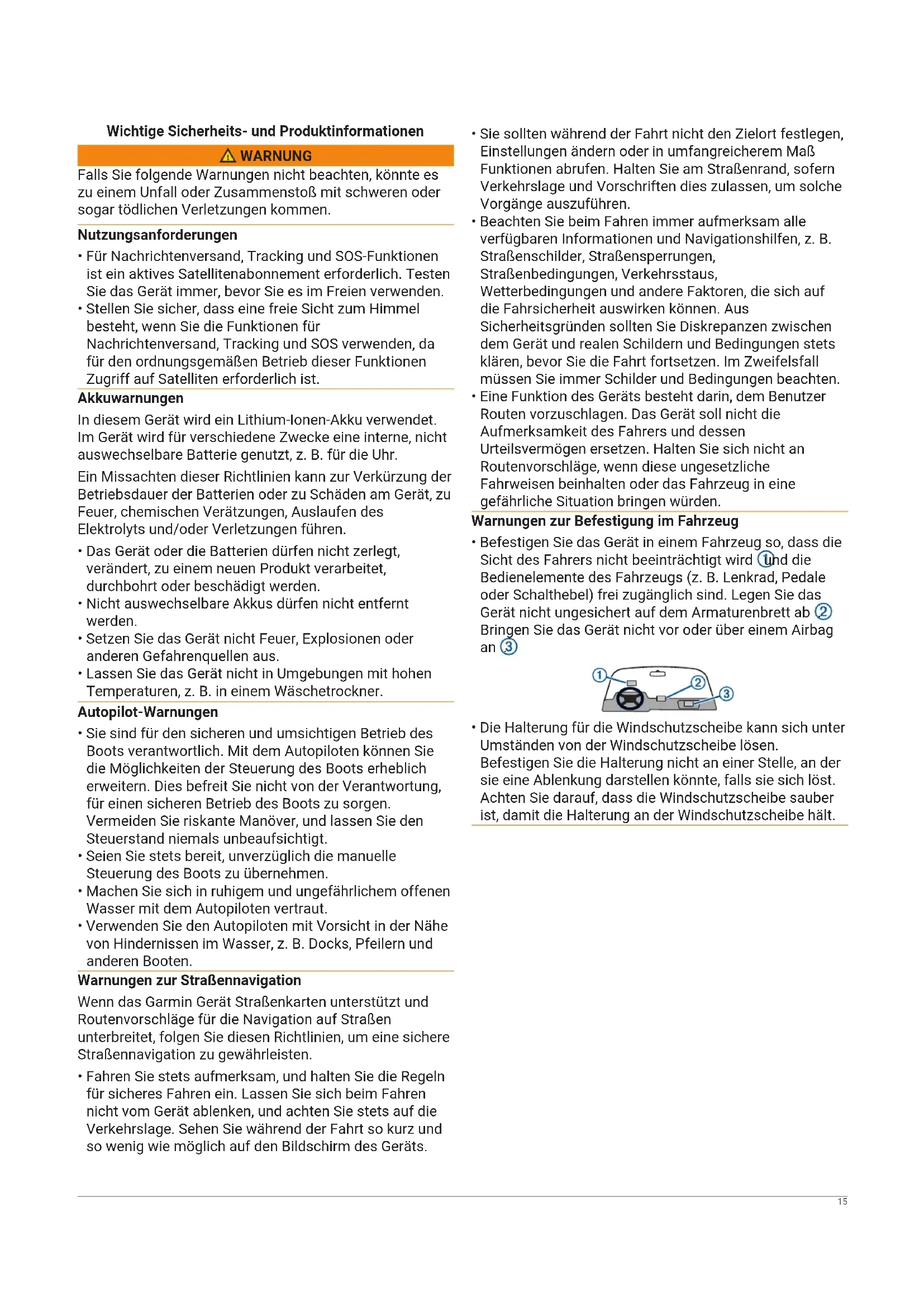 - Verwenden Sie den Autopiloten mit Vorsicht in der Nähe von Hindernissen im Wasser, z. B. Docks, Pfeilern und anderen Booten. Warnungen zur Straßennavigation Wenn das Garmin Gerät Straßenkarten unterstützt und Routenvorschläge für die Navigation auf Straßen unterbreitet, folgen Sie diesen Richtlinien, um eine sichere Straßennavigation zu gewährleisten.
