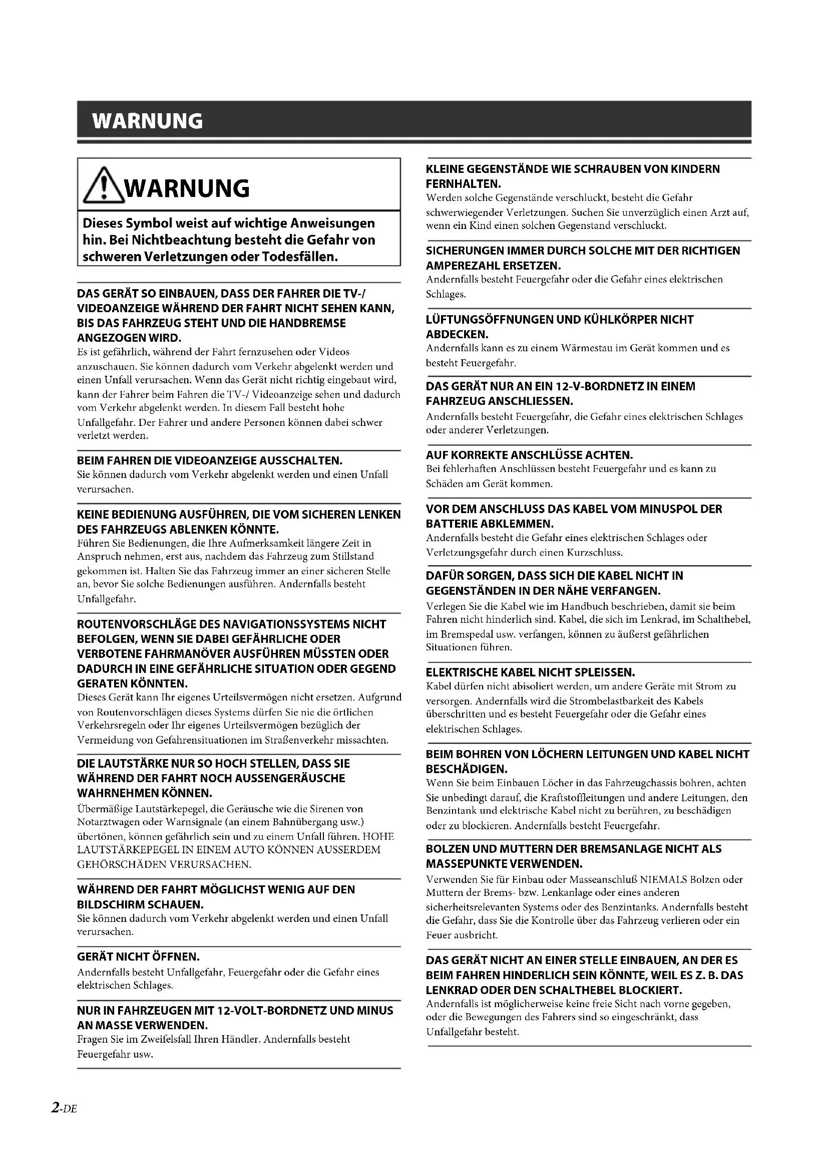 - Technische Daten ALPINE X902D/X802D-U/INE-W710D/i902D/iLX-702D 68-34732Z07-A (DE) 2-DE WARNUNG WARNUNG Dieses Symbol weist auf wichtige Anweisungen hin. Bei Nichtbeachtung besteht die Gefahr von schweren Verletzungen oder Todesfällen. DAS GERÄT SO EINBAUEN, DASS DER FAHRER DIE TV-/VIDEOANZEIGE WÄHREND DER FAHRT NICHT SEHEN KANN, BIS DAS FAHRZEUG STEHT UND DIE HANDBREMSE ANGEZOGEN WIRD.Es ist gefährlich, während der Fahrt fernzusehen oder Videos anzuschauen. Sie können dadurch vom Verkehr abgelenkt werden und einen Unfall verursachen. Wenn das Gerät nicht richtig eingebaut wird, kann der Fahrer beim Fahren die TV-/ Videoanzeige sehen und dadurch vom Verkehr abgelenkt werden. In diesem Fall besteht hohe Unfallgefahr. Der Fahrer und andere Personen können dabei schwer verletzt werden.BEIM FAHREN DIE VIDEOANZEIGE AUSSCHALTEN.Sie können dadurch vom Verkehr abgelenkt werden und einen Unfall verursachen.KEINE BEDIENUNG AUSFÜHREN, DIE VOM SICHEREN LENKEN DES FAHRZEUGS ABLENKEN KÖNNTE.Führen Sie Bedienungen, die Ihre Aufmerksamkeit längere Zeit in Anspruch nehmen, erst aus, nachdem das Fahrzeug zum Stillstand gekommen ist. Halten Sie das Fahrzeug immer an einer sicheren Stelle an, bevor Sie solche Bedienungen ausführen. Andernfalls besteht Unfallgefahr.ROUTENVORSCHLÄGE DES NAVIGATIONSSYSTEMS NICHT BEFOLGEN, WENN SIE DABEI GEFÄHRLICHE ODER VERBOTENE FAHRMANÖVER AUSFÜHREN MÜSSTEN ODER DADURCH IN EINE GEFÄHRLICHE SITUATION ODER GEGEND GERATEN KÖNNTEN.Dieses Gerät kann Ihr eigenes Urteilsvermögen nicht ersetzen. Aufgrund von Routenvorschlägen dieses Systems dürfen Sie nie die örtlichen Verkehrsregeln oder Ihr eigenes Urteilsvermögen bezüglich der Vermeidung von Gefahrensituationen im Straßenverkehr missachten.DIE LAUTSTÄRKE NUR SO HOCH STELLEN, DASS SIE WÄHREND DER FAHRT NOCH AUSSENGERÄUSCHE WAHRNEHMEN KÖNNEN.Übermäßige Lautstärkepegel, die Geräusche wie die Sirenen von Notarztwagen oder Warnsignale (an einem Bahnübergang usw.) übertönen, können gefährlich sein und zu einem Unfall führen. HOHE LAUTSTÄRKEPEGEL IN EINEM AUTO KÖNNEN AUSSERDEM GEHÖRSCHÄDEN VERURSACHEN.WÄHREND DER FAHRT MÖGLICHST WENIG AUF DEN BILDSCHIRM SCHAUEN.Sie können dadurch vom Verkehr abgelenkt werden und einen Unfall verursachen.GERÄT NICHT ÖFFNEN.Andernfalls besteht Unfallgefahr, Feuergefahr oder die Gefahr eines elektrischen Schlages.NUR IN FAHRZEUGEN MIT 12-VOLT-BORDNETZ UND MINUS AN MASSE VERWENDEN.Fragen Sie im Zweifelsfall Ihren Händler. Andernfalls besteht Feuergefahr usw.KLEINE GEGENSTÄNDE WIE SCHRAUBEN VON KINDERN FERNHALTEN.Werden solche Gegenstände verschluckt, besteht die Gefahr schwerwiegender Verletzungen. Suchen Sie unverzüglich einen Arzt auf, wenn ein Kind einen solchen Gegenstand verschluckt.SICHERUNGEN IMMER DURCH SOLCHE MIT DER RICHTIGEN AMPEREZAHL ERSETZEN.Andernfalls besteht Feuergefahr oder die Gefahr eines elektrischen Schlages.LÜFTUNGSÖFFNUNGEN UND KÜHLKÖRPER NICHT ABDECKEN.Andernfalls kann es zu einem Wärmestau im Gerät kommen und es besteht Feuergefahr.DAS GERÄT NUR AN EIN 12-V-BORDNETZ IN EINEM FAHRZEUG ANSCHLIESSEN.Andernfalls besteht Feuergefahr, die Gefahr eines elektrischen Schlages oder anderer Verletzungen.AUF KORREKTE ANSCHLÜSSE ACHTEN.Bei fehlerhaften Anschlüssen besteht Feuergefahr und es kann zu Schäden am Gerät kommen.VOR DEM ANSCHLUSS DAS KABEL VOM MINUSPOL DER BATTERIE ABKLEMMEN.Andernfalls besteht die Gefahr eines elektrischen Schlages oder Verletzungsgefahr durch einen Kurzschluss.DAFÜR SORGEN, DASS SICH DIE KABEL NICHT IN GEGENSTÄNDEN IN DER NÄHE VERFANGEN.Verlegen Sie die Kabel wie im Handbuch beschrieben, damit sie beim Fahren nicht hinderlich sind. Kabel, die sich im Lenkrad, im Schalthebel, im Bremspedal usw. verfangen, können zu äußerst gefährlichen Situationen führen.ELEKTRISCHE KABEL NICHT SPLEISSEN.Kabel dürfen nicht abisoliert werden, um andere Geräte mit Strom zu versorgen. Andernfalls wird die Strombelastbarkeit des Kabels überschritten und es besteht Feuergefahr oder die Gefahr eines elektrischen Schlages.BEIM BOHREN VON LÖCHERN LEITUNGEN UND KABEL NICHT BESCHÄDIGEN.Wenn Sie beim Einbauen Löcher in das Fahrzeugchassis bohren, achten Sie unbedingt darauf, die Kraftstoffleitungen und andere Leitungen, den Benzintank und elektrische Kabel nicht zu berühren, zu beschädigen oder zu blockieren. Andernfalls besteht Feuergefahr.BOLZEN UND MUTTERN DER BREMSANLAGE NICHT ALS MASSEPUNKTE VERWENDEN.Verwenden Sie für Einbau oder Masseanschluß NIEMALS Bolzen oder Muttern der Brems- bzw. Lenkanlage oder eines anderen sicherheitsrelevanten Systems oder des Benzintanks. Andernfalls besteht die Gefahr, dass Sie die Kontrolle über das Fahrzeug verlieren oder ein Feuer ausbricht.DAS GERÄT NICHT AN EINER STELLE EINBAUEN, AN DER ES BEIM FAHREN HINDERLICH SEIN KÖNNTE, WEIL ES Z. B. DAS LENKRAD ODER DEN SCHALTHEBEL BLOCKIERT.Andernfalls ist möglicherweise keine freie Sicht nach vorne gegeben, oder die Bewegungen des Fahrers sind so eingeschränkt, dass Unfallgefahr besteht. p. 17