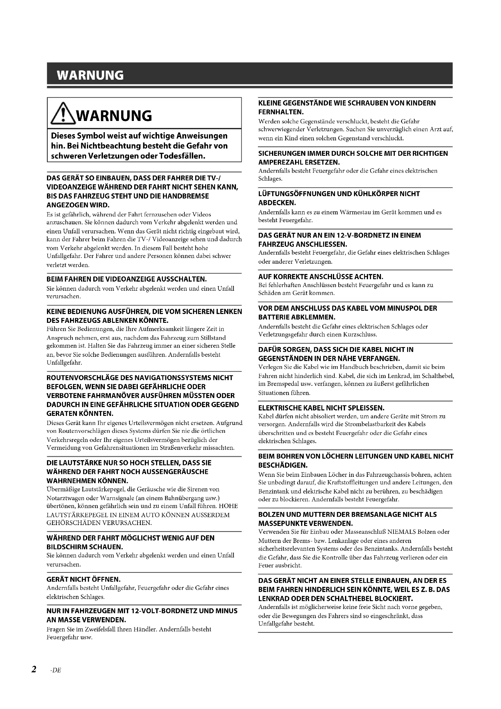 - Technische Daten ALPINE X801D-U 68-29530Z16-A_QRG (DE) 2-DE WARNUNG WARNUNG Dieses Symbol weist auf wichtige Anweisungen hin. Bei Nichtbeachtung besteht die Gefahr von schweren Verletzungen oder Todesfällen. DAS GERÄT SO EINBAUEN, DASS DER FAHRER DIE TV-/VIDEOANZEIGE WÄHREND DER FAHRT NICHT SEHEN KANN, BIS DAS FAHRZEUG STEHT UND DIE HANDBREMSE ANGEZOGEN WIRD.Es ist gefährlich, während der Fahrt fernzusehen oder Videos anzuschauen. Sie können dadurch vom Verkehr abgelenkt werden und einen Unfall verursachen. Wenn das Gerät nicht richtig eingebaut wird, kann der Fahrer beim Fahren die TV-/ Videoanzeige sehen und dadurch vom Verkehr abgelenkt werden. In diesem Fall besteht hohe Unfallgefahr. Der Fahrer und andere Personen können dabei schwer verletzt werden.BEIM FAHREN DIE VIDEOANZEIGE AUSSCHALTEN.Sie können dadurch vom Verkehr abgelenkt werden und einen Unfall verursachen.KEINE BEDIENUNG AUSFÜHREN, DIE VOM SICHEREN LENKEN DES FAHRZEUGS ABLENKEN KÖNNTE.Führen Sie Bedienungen, die Ihre Aufmerksamkeit längere Zeit in Anspruch nehmen, erst aus, nachdem das Fahrzeug zum Stillstand gekommen ist. Halten Sie das Fahrzeug immer an einer sicheren Stelle an, bevor Sie solche Bedienungen ausführen. Andernfalls besteht Unfallgefahr.ROUTENVORSCHLÄGE DES NAVIGATIONSSYSTEMS NICHT BEFOLGEN, WENN SIE DABEI GEFÄHRLICHE ODER VERBOTENE FAHRMANÖVER AUSFÜHREN MÜSSTEN ODER DADURCH IN EINE GEFÄHRLICHE SITUATION ODER GEGEND GERATEN KÖNNTEN.Dieses Gerät kann Ihr eigenes Urteilsvermögen nicht ersetzen. Aufgrund von Routenvorschlägen dieses Systems dürfen Sie nie die örtlichen Verkehrsregeln oder Ihr eigenes Urteilsvermögen bezüglich der Vermeidung von Gefahrensituationen im Straßenverkehr missachten.DIE LAUTSTÄRKE NUR SO HOCH STELLEN, DASS SIE WÄHREND DER FAHRT NOCH AUSSENGERÄUSCHE WAHRNEHMEN KÖNNEN.Übermäßige Lautstärkepegel, die Geräusche wie die Sirenen von Notarztwagen oder Warnsignale (an einem Bahnübergang usw.) übertönen, können gefährlich sein und zu einem Unfall führen. HOHE LAUTSTÄRKEPEGEL IN EINEM AUTO KÖNNEN AUSSERDEM GEHÖRSCHÄDEN VERURSACHEN.WÄHREND DER FAHRT MÖGLICHST WENIG AUF DEN BILDSCHIRM SCHAUEN.Sie können dadurch vom Verkehr abgelenkt werden und einen Unfall verursachen.GERÄT NICHT ÖFFNEN.Andernfalls besteht Unfallgefahr, Feuergefahr oder die Gefahr eines elektrischen Schlages.NUR IN FAHRZEUGEN MIT 12-VOLT-BORDNETZ UND MINUS AN MASSE VERWENDEN.Fragen Sie im Zweifelsfall Ihren Händler. Andernfalls besteht Feuergefahr usw.KLEINE GEGENSTÄNDE WIE SCHRAUBEN VON KINDERN FERNHALTEN.Werden solche Gegenstände verschluckt, besteht die Gefahr schwerwiegender Verletzungen. Suchen Sie unverzüglich einen Arzt auf, wenn ein Kind einen solchen Gegenstand verschluckt.SICHERUNGEN IMMER DURCH SOLCHE MIT DER RICHTIGEN AMPEREZAHL ERSETZEN.Andernfalls besteht Feuergefahr oder die Gefahr eines elektrischen Schlages.LÜFTUNGSÖFFNUNGEN UND KÜHLKÖRPER NICHT ABDECKEN.Andernfalls kann es zu einem Wärmestau im Gerät kommen und es besteht Feuergefahr.DAS GERÄT NUR AN EIN 12-V-BORDNETZ IN EINEM FAHRZEUG ANSCHLIESSEN.Andernfalls besteht Feuergefahr, die Gefahr eines elektrischen Schlages oder anderer Verletzungen.AUF KORREKTE ANSCHLÜSSE ACHTEN.Bei fehlerhaften Anschlüssen besteht Feuergefahr und es kann zu Schäden am Gerät kommen.VOR DEM ANSCHLUSS DAS KABEL VOM MINUSPOL DER BATTERIE ABKLEMMEN.Andernfalls besteht die Gefahr eines elektrischen Schlages oder Verletzungsgefahr durch einen Kurzschluss.DAFÜR SORGEN, DASS SICH DIE KABEL NICHT IN GEGENSTÄNDEN IN DER NÄHE VERFANGEN.Verlegen Sie die Kabel wie im Handbuch beschrieben, damit sie beim Fahren nicht hinderlich sind. Kabel, die sich im Lenkrad, im Schalthebel, im Bremspedal usw. verfangen, können zu äußerst gefährlichen Situationen führen.ELEKTRISCHE KABEL NICHT SPLEISSEN.Kabel dürfen nicht abisoliert werden, um andere Geräte mit Strom zu versorgen. Andernfalls wird die Strombelastbarkeit des Kabels überschritten und es besteht Feuergefahr oder die Gefahr eines elektrischen Schlages.BEIM BOHREN VON LÖCHERN LEITUNGEN UND KABEL NICHT BESCHÄDIGEN.Wenn Sie beim Einbauen Löcher in das Fahrzeugchassis bohren, achten Sie unbedingt darauf, die Kraftstoffleitungen und andere Leitungen, den Benzintank und elektrische Kabel nicht zu berühren, zu beschädigen oder zu blockieren. Andernfalls besteht Feuergefahr.BOLZEN UND MUTTERN DER BREMSANLAGE NICHT ALS MASSEPUNKTE VERWENDEN.Verwenden Sie für Einbau oder Masseanschluß NIEMALS Bolzen oder Muttern der Brems- bzw. Lenkanlage oder eines anderen sicherheitsrelevanten Systems oder des Benzintanks. Andernfalls besteht die Gefahr, dass Sie die Kontrolle über das Fahrzeug verlieren oder ein Feuer ausbricht.DAS GERÄT NICHT AN EINER STELLE EINBAUEN, AN DER ES BEIM FAHREN HINDERLICH SEIN KÖNNTE, WEIL ES Z. B. DAS LENKRAD ODER DEN SCHALTHEBEL BLOCKIERT.Andernfalls ist möglicherweise keine freie Sicht nach vorne gegeben, oder die Bewegungen des Fahrers sind so eingeschränkt, dass Unfallgefahr besteht. p. 16