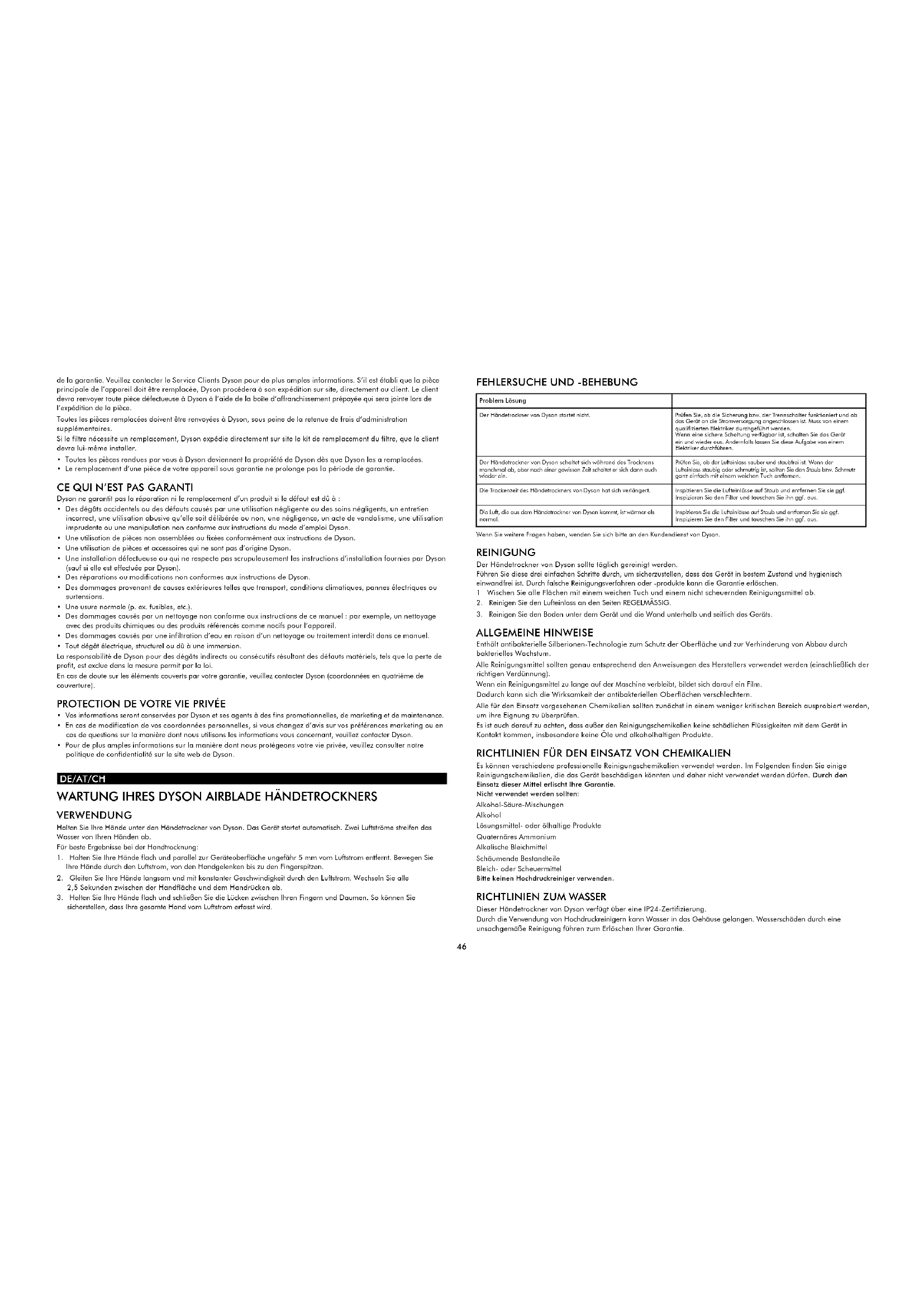 Damit wir Ihnen schnellen und effizienten Service bieten können, registrieren Sie Ihr Gerät bitte unter www.dysonairblade.com Dadurch registrieren Sie Ihre Garantie, bestätigen sich selbst als Eigentümer Ihres Dyson Geräts für den Fall eines Versicherungsschadens und ermöglichen es uns, bei Bedarf mit Ihnen Kontakt aufzunehmen. Sie benötigen hierzu Ihre Seriennummer, die Sie auf dem Typenschild am Sockel Ihres Geräts, auf dem Registrierungsblatt im Karton sowie nach dem Auspacken auf dem großen Info-Aufkleber an der Vorderseite der Verpackung finden. Bitte vergewissern Sie sich, dass alle Anweisungen und Erläuterungen in dieser Bedienungsanleitung eingehalten werden, da sonst die Garantie für das Gerät erlischt. IHRE GARANTIE ALLGEMEINE BEDINGUNGEN DER AUF 5 JAHRE BEGRENZTEN DYSON GARANTIE Wenn Sie Ihr Gerät online registriert haben, beginnt Ihre Gewährleistung ab dem Kaufdatum zu laufen. Bitte bewahren Sie Ihren Kaufnachweis auf. Wenn Sie keinen Kaufnachweis vorlegen können, beginnt Ihre Gewährleistung 90 Tage nach dem Fertigungsdatum entsprechend den Aufzeichnungen von Dyson.48 Wenn dieses Gerät innerhalb der EU verkauft wird, gilt diese Gewährleistung nur, (i) wenn das Gerät in dem Land, in dem es verkauft wurde, eingerichtet und verwendet wird oder (ii) wenn das Gerät in Belgien, Deutschland, Frankreich, Großbritannien, Irland, Italien, den Niederlanden, Österreich oder Spanien eingerichtet und verwendet wird und das gleiche Modell wie dieses Gerät mit der gleichen Nennspannung im jeweiligen Land verkauft wird. Wenn dieses Gerät außerhalb der EU verkauft wird, gilt diese Gewährleistung nur, wenn das Gerät in dem Land, in dem es verkauft wurde, eingerichtet und verwendet wird.
