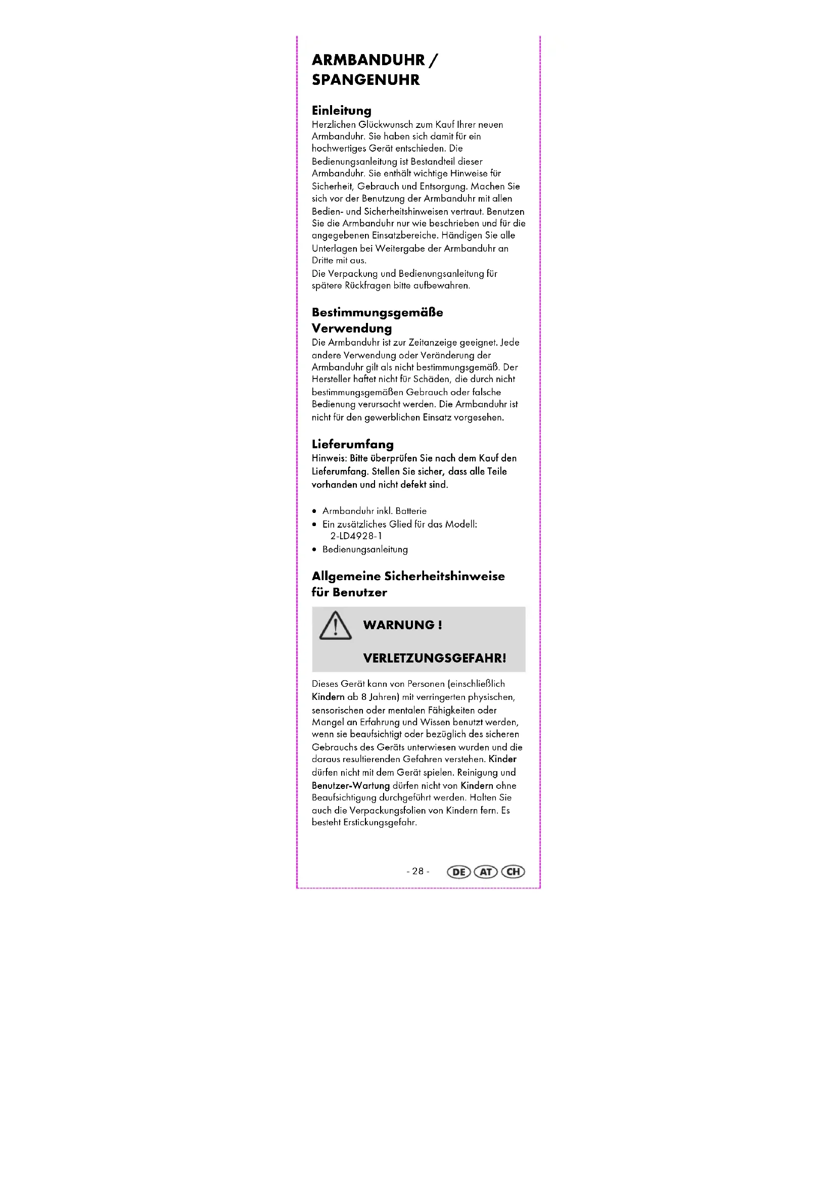 ARMBANDUHR / SPANGENUHR Einleitung Herzlichen Glückwunsch zum Kauf Ihrer neuen Armbanduhr. Sie haben sich damit für ein hochwertiges Gerät entschieden. Die Bedienungsanleitung ist Bestandteil dieser Armbanduhr. Sie enthält wichtige Hinweise für Sicherheit, Gebrauch und Entsorgung. Machen Sie sich vor der Benutzung der Armbanduhr mit allen Bedien- und Sicherheitshinweisen vertraut. Benutzen Sie die Armbanduhr nur wie beschrieben und für die angegebenen Einsatzbereiche. Händigen Sie alle Unterlagen bei Weitergabe der Armbanduhr an Dritte mit aus. Die Verpackung und Bedienungsanleitung für spätere Rückfragen bitte aufbewahren. Bestimmungsgemäße Verwendung Die Armbanduhr ist zur Zeitanzeige geeignet. Jede andere Verwendung oder Veränderung der Armbanduhr gilt als nicht bestimmungsgemäß. Der Hersteller haftet nicht für Schäden, die durch nicht bestimmungsgemäßen Gebrauch oder falsche Bedienung verursacht werden. Die Armbanduhr ist nicht für den gewerblichen Einsatz vorgesehen. Lieferumfang Hinweis: Bitte überprüfen Sie nach dem Kauf den Lieferumfang. Stellen Sie sicher, dass alle Teile vorhanden und nicht defekt sind. Armbanduhr inkl. Batterie Ein zusätzliches Glied für das Modell: 2-LD4928-1 Bedienungsanleitung Allgemeine Sicherheitshinweise für Benutzer