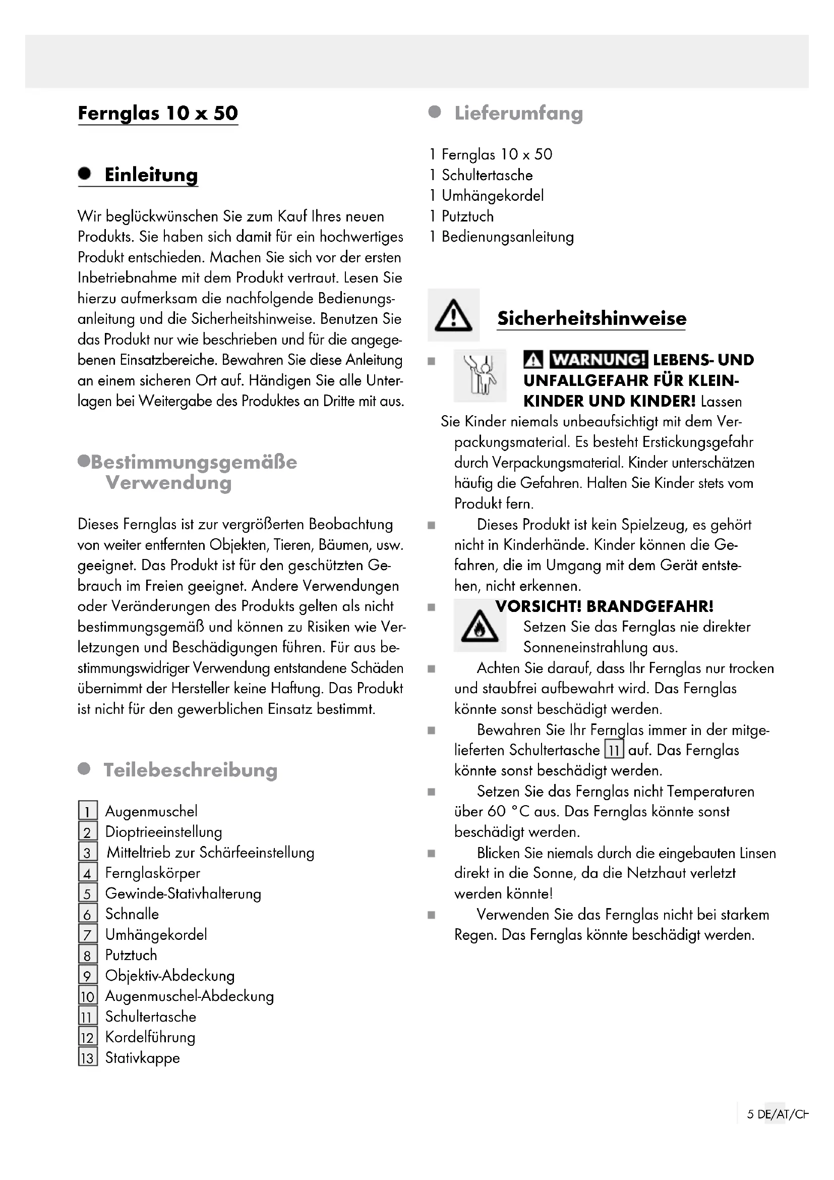 Lieferumfang 1 Fernglas 10 x 50 1 Schultertasche 1 Umhängekordel 1 Putztuch 1 Bedienungsanleitung Sicherheitshinweise LEBENS- UND