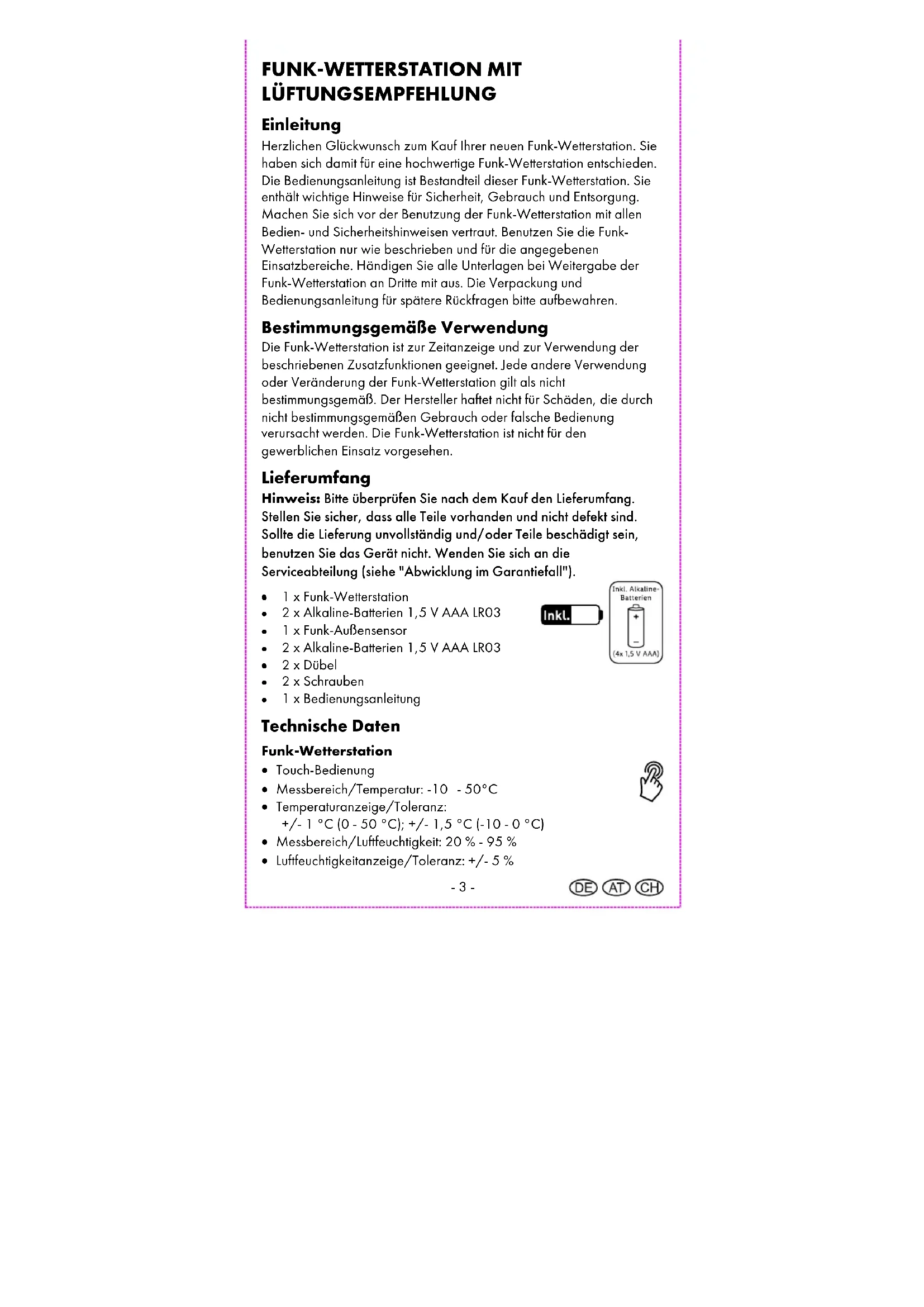 1 x Bedienungsanleitung Technische Daten Funk-Wetterstation Touch-Bedienung Messbereich/Temperatur: -10 - 50°C Temperaturanzeige/Toleranz: +/- 1 °C (0 - 50 °C); +/- 1,5 °C (-10 - 0 °C) Messbereich/Luftfeuchtigkeit: 20 % - 95 % Luftfeuchtigkeitanzeige/Toleranz: +/- 5 %- 4 - Maße: ca. 15,0 x 9,6 x 2,3 cm Gewicht: ca. 160 g (exkl. Batterie) Batterien: 2 x 1,5 V AAA R03/LR03 (UM-4) Funk-Außensensor Messbereich/Temperatur: -40 - 60 °C Temperaturanzeige/Toleranz: +/- 1 °C (0 - 50 °C); +/- 2 °C (-40 - 0 °C, 50 - 60 °C) Messbereich/Luftfeuchtigkeit: 20 % - 95 % Luftfeuchtigkeitanzeige/Toleranz: +/- 5 % Reichweite: max. 50 m Übertragungsfrequenz: 433 MHz Sendeleistung: 0,024 W Schutzart durch das Gehäuse (Funk-Außensensor): IPX4 (Spritzwasserschutz nach Norm IEC 60529) Maße: ca. 5,0 x 9,7 x 2,9 cm Gewicht: ca. 45 g (exkl. Batterie) Batterien: 2 x 1,5 V AAA R03/LR03 (UM-4) - Kennzeichen für Gleichstpannung Wichtige Sicherheitshinweise Sicherheitshinweise für Benutzer