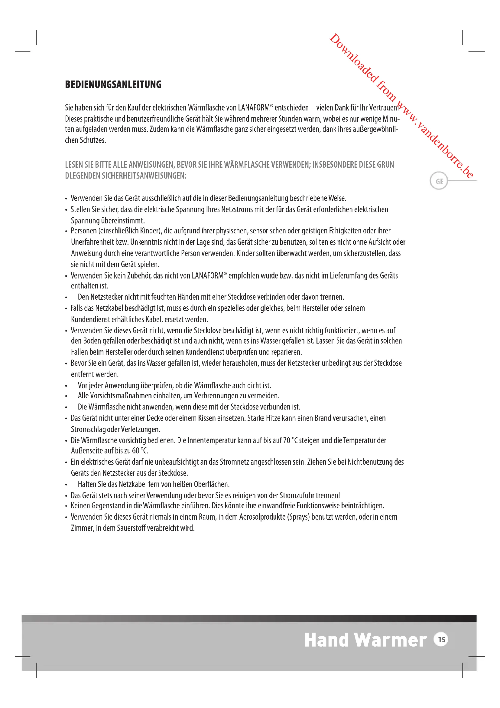 BEDIENUNGSANLEITUNG Sie haben sich für den Kauf der elektrischen Wärmasche von LANAFORM® entschieden – vielen Dank für Ihr Vertrauen! Dieses praktische und benutzerfreundliche Gerät hält Sie während mehrerer Stunden warm, wobei es nur wenige Minu- ten aufgeladen werden muss. Zudem kann die Wärmasche ganz sicher eingesetzt werden, dank ihres außergewöhnli- chen Schutzes. LESEN SIE BITTE ALLE ANWEISUNGEN, BEVOR SIE IHRE WÄRMFLASCHE VERWENDEN; INSBESONDERE DIESE GRUN- DLEGENDEN SICHERHEITSANWEISUNGEN: