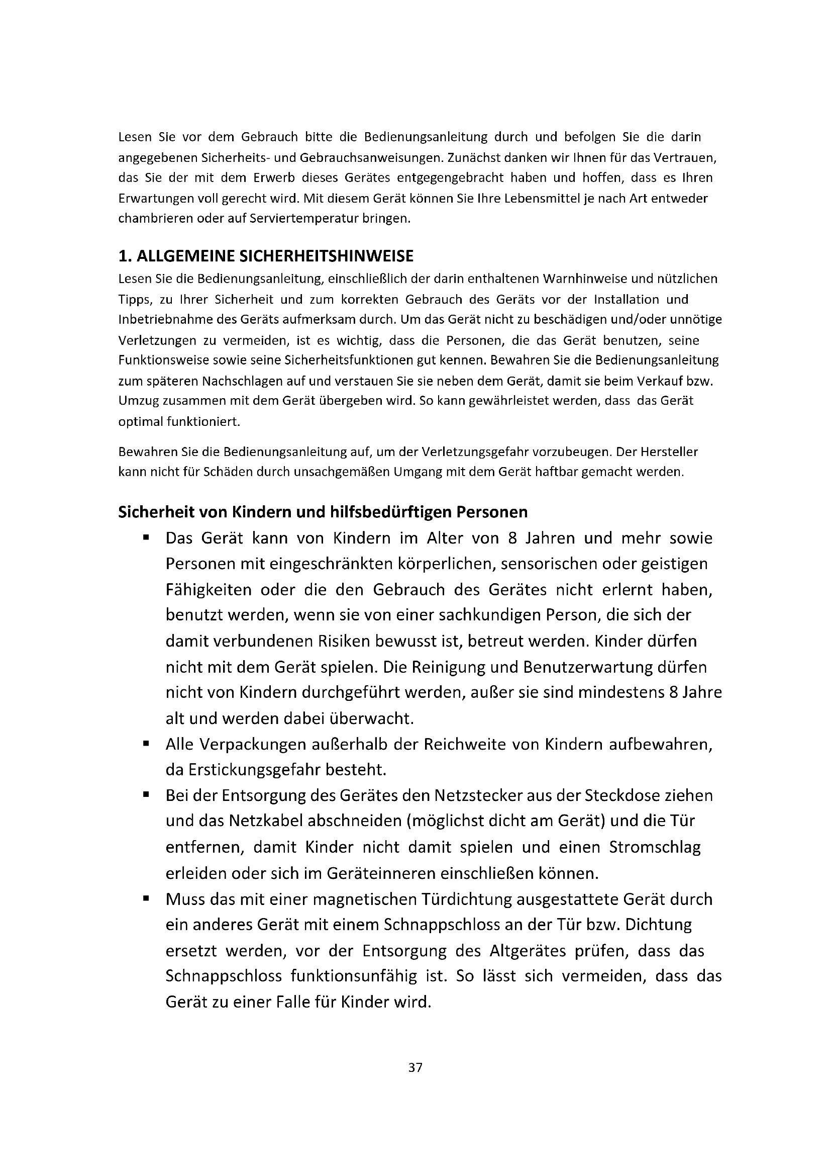 Lesen Sie die Bedienungsanleitung, einschließlich der darin enthaltenen Warnhinweise und nützlichen Tipps, zu Ihrer Sicherheit und zum korrekten Gebrauch des Geräts vor der Installation und Inbetriebnahme des Geräts aufmerksam durch. Um das Gerät nicht zu beschädigen und/oder unnötige Verletzungen zu vermeiden, ist es wichtig, dass die Personen, die das Gerät benutzen, seine Funktionsweise sowie seine Sicherheitsfunktionen gut kennen. Bewahren Sie die Bedienungsanleitung zum späteren Nachschlagen auf und verstauen Sie sie neben dem Gerät, damit sie beim Verkauf bzw. Umzug zusammen mit dem Gerät übergeben wird. So kann gewährleistet werden, dass das Gerät optimal funktioniert. Bewahren Sie die Bedienungsanleitung auf, um der Verletzungsgefahr vorzubeugen. Der Hersteller kann nicht für Schäden durch unsachgemäßen Umgang mit dem Gerät haftbar gemacht werden. Sicherheit von Kindern und hilfsbedürftigen Personen