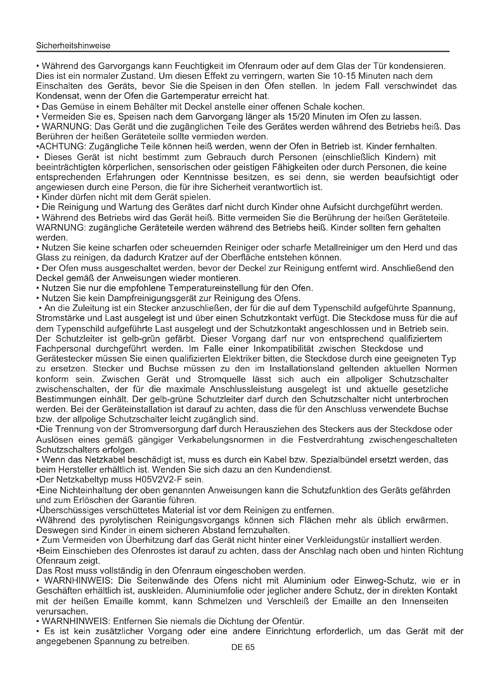 - Es ist kein zusätzlicher Vorgang oder eine andere Einrichtung erforderlich, um das Gerät mit der angegebenen Spannung zu betreiben. Sicherheitshinweise DE 65Zusammenfassung DE 66 Reinigung und Wartung des Backofens Allgemeine Anweisungen