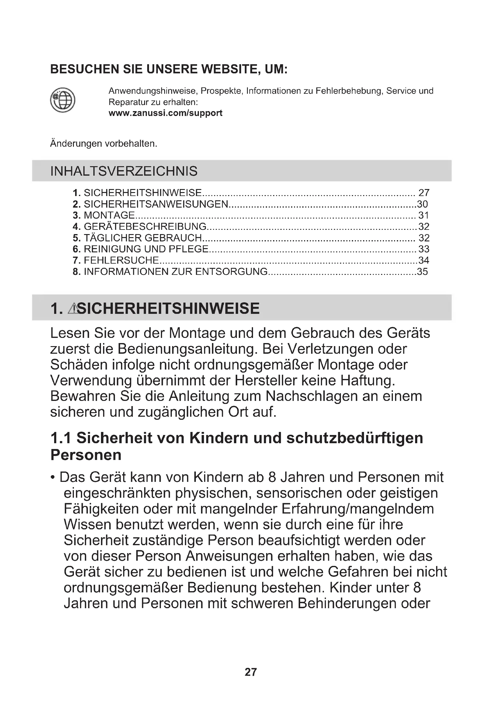 Ihre Pflichten als Endnutzer Dieses Elektro- bzw. Elektronikgerät ist mit einer durchgestrichenen Abfalltonne auf Rädern gekennzeichnet. Das Gerät darf deshalb nur getrennt vom unsortierten Siedlungsabfall gesammelt und zurückgenommen werden, es darf also nicht in den Hausmüll gegeben werden. Das Gerät kann z. B. bei einer kommunalen Sammelstelle oder ggf. bei einem Vertreiber (siehe zu deren Rücknahmepflichten unten) abgegeben werden. Das gilt auch für alle Bauteile, Unterbaugruppen und Verbrauchsmaterialien des zu entsorgenden Altgeräts. Bevor das Altgerät entsorgt werden darf, müssen alle Altbatterien und Altakkumulatoren vom Altgerät getrennt werden, die nicht vom Altgerät umschlossen sind. Das gleiche gilt für Lampen, die zerstörungsfrei aus dem Altgerät entnommen werden können. Der Endnutzer ist zudem selbst dafür verantwortlich, personenbezogene Daten auf dem Altgerät zu löschen. Hinweise zum Recycling Helfen Sie mit, alle Materialien zu recyceln, die mit diesem Symbol gekennzeichnet sind. Entsorgen Sie solche Materialien, insbesondere Verpackungen, nicht im Hausmüll sondern über die bereitgestellten Recyclingbehälter oder die entsprechenden örtlichen Sammelsysteme. Recyceln Sie zum Umwelt- und Gesundheitsschutz auch elektrische und elektronische Geräte. Rücknahmepflichten der Vertreiber in Deutschland Wer auf mindestens 400 m² Verkaufsfläche Elektro- und Elektronikgeräte vertreibt oder sonst geschäftlich an Endnutzer abgibt, ist verpflichtet, bei Abgabe eines neuen Geräts ein Altgerät des Endnutzers der gleichen Geräteart, das im Wesentlichen die gleichen Funktionen wie das neue Gerät erfüllt, am Ort der Abgabe oder in unmittelbarer Nähe hierzu unentgeltlich zurückzunehmen. Das gilt auch für Vertreiber von Lebensmitteln mit einer Gesamtverkaufsfläche von mindestens 800 m², die mehrmals im Kalenderjahr oder dauerhaft Elektro- und Elektronikgeräte anbieten und auf dem Markt bereitstellen. Solche Vertreiber müssen zudem auf Verlangen des Endnutzers Altgeräte, die in keiner äußeren Abmessung größer als 25 cm sind (kleine Elektrogeräte), im Einzelhandelsgeschäft oder in unmittelbarer Nähe hierzu unentgeltlich zurückzunehmen; die Rücknahme darf in diesem Fall nicht an den Kauf eines Elektro- oder Elektronikgerätes geknüpft, kann aber auf drei Altgeräte pro Geräteart beschränkt werden. Ort der Abgabe ist auch der private Haushalt, wenn das neue Elektro- oder Elektronikgerät dorthin geliefert wird; in diesem Fall ist die Abholung des Altgerätes für den Endnutzer kostenlos. 35Die vorstehenden Pflichten gelten auch für den Vertrieb unter Verwendung von Fernkommunikationsmitteln, wenn die Vertreiber Lager- und Versandflächen für Elektro- und Elektronikgeräte bzw. Gesamtlager- und -versandflächen für Lebensmittel vorhalten, die den oben genannten Verkaufsflächen entsprechen. Die unentgeltliche Abholung von Elektro- und Elektronikgeräten ist dann aber auf Wärmeüberträger (z. B. Kühlschrank), Bildschirme, Monitore und Geräte, die Bildschirme mit einer Oberfläche von mehr als 100 cm² enthalten, und Geräte beschränkt, bei denen mindestens eine der äußeren Abmessungen mehr als 50 cm beträgt. Für alle übrigen Elektro- und Elektronikgeräte muss der Vertreiber geeignete Rückgabemöglichkeiten in zumutbarer Entfernung zum jeweiligen Endnutzer gewährleisten; das gilt auch für kleine Elektrogeräte (s.o.), die der Endnutzer zurückgeben will, ohne ein neues Gerät zu kaufen. Rücknahmepflichten von Vertreibern und andere Möglichkeiten der Entsorgung von Elektro- und Elektronikgeräten in der Region Wallonien Vertreiber, die Elektro- und Elektronikgeräte verkaufen, sind verpflichtet, bei der Lieferung von Neugeräten Altgeräte desselben Typs, die im Wesentlichen die gleichen Funktionen wie die Neugeräte erfüllen, kostenlos vom Endverbraucher zurückzunehmen. Dies gilt auch bei der Lieferung von neuen Elektro- und Elektronikgeräten oder beim Fernabsatz. Darüber hinaus ist jeder, der Elektro- und Elektronikgeräte auf einer Verkaufsfläche von mindestens 400 m² verkauft, verpflichtet, Altgeräte, die in keiner äußeren Abmessung größer als 25 cm sind (Elektrokleingeräte), im Ladengeschäft oder in unmittelbarer Nähe kostenlos zurückzunehmen; die Rücknahme darf in diesem Fall nicht vom Kauf eines Elektro- oder Elektronikgerätes abhängig gemacht werden. Die Rücknahme von Elektro- und Elektronikgeräten kann auch auf Containerplätzen oder zugelassenen Recyclinghöfen erfolgen. Für weitere Informationen wenden Sie sich bitte an Ihre Gemeindeverwaltung. 36ΕΠΙΣΚΕΦΘΕΙΤΕ ΤΟΝ ΙΣΤΟΤΟΠΟ ΜΑΣ ΓΙΑ ΝΑ: Βρείτε υποδείξεις χρήσης, φυλλάδια, συμβουλές για την επίλυση προβλημάτων,πληροφορίες σέρβις και επισκευής:www.zanussi.com/supportΥπόκειται αε αλλαγές χωρίς προειδποίηση. ΠΕΡΙΕΧΟΜΕΝΑ