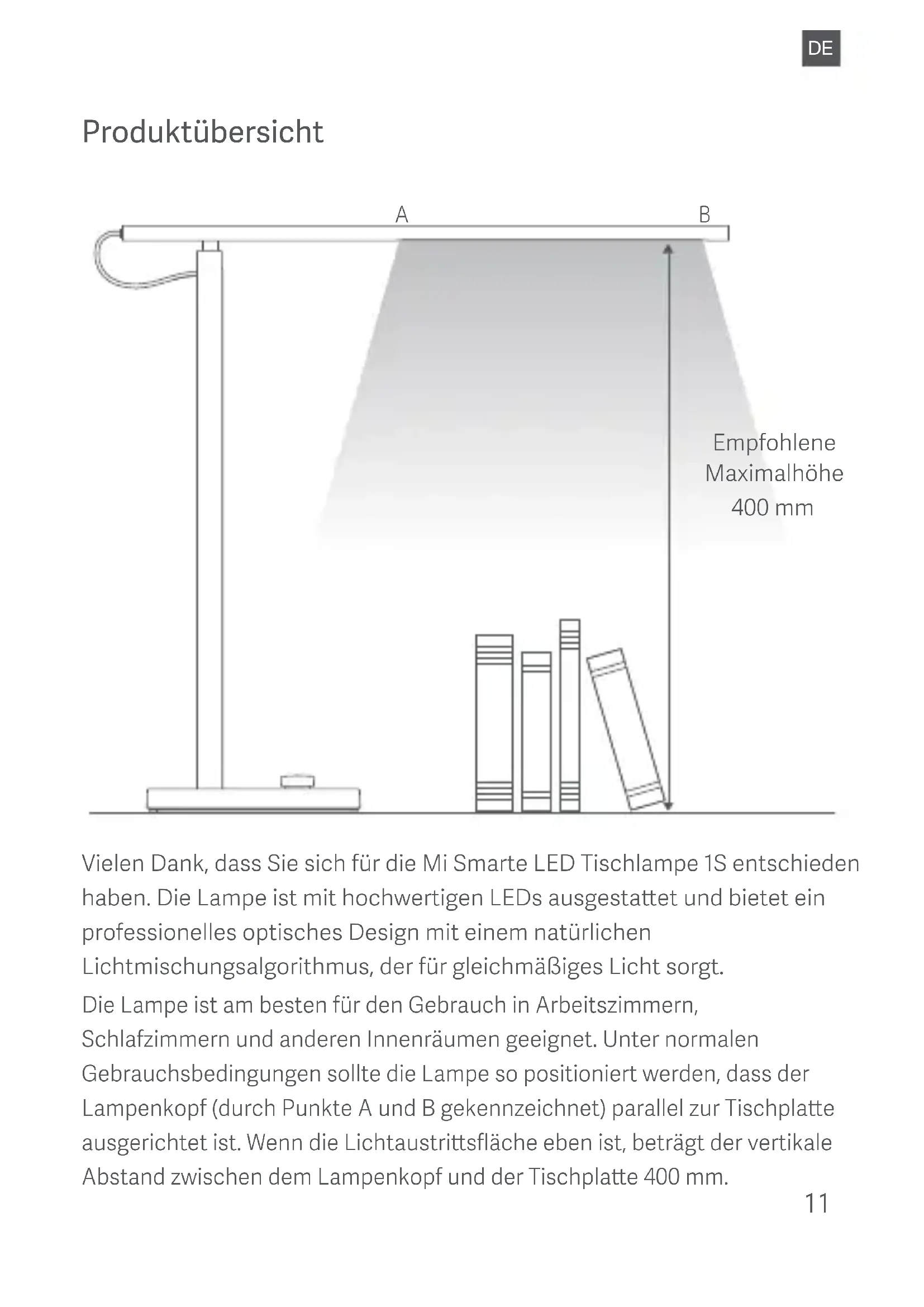 Produktübersicht Empfohlene Maximalhöhe 400 mm Vielen Dank, dass Sie sich für die Mi Smarte LED Tischlampe 1S entschieden haben. Die Lampe ist mit hochwertigen LEDs ausgestaet und bietet ein professionelles optisches Design mit einem natürlichen Lichtmischungsalgorithmus, der für gleichmäßiges Licht sorgt. A B Die Lampe ist am besten für den Gebrauch in Arbeitszimmern, Schlafzimmern und anderen Innenräumen geeignet. Unter normalen Gebrauchsbedingungen sollte die Lampe so positioniert werden, dass der Lampenkopf (durch Punkte A und B gekennzeichnet) parallel zur Tischplae ausgerichtet ist. Wenn die Lichtaustrisfläche eben ist, beträgt der vertikale Abstand zwischen dem Lampenkopf und der Tischplae 400 mm.Verwendung der Lampe Schließen Sie das Stromkabel an. Stecken Sie das Stromkabel in den Ladeanschluss am Fuß und schließen Sie das Netzteil an eine Stromquelle an. Einstellknopf Netzteil Lampenkörper Um 135° einstellbarer Winkel Ladeanschluss